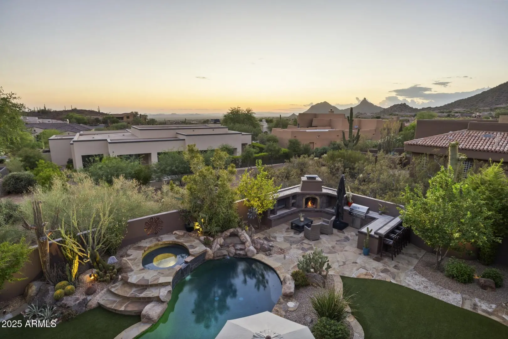 Resort-style living in the prestigious and majestic mountain gated community of Troon Ridge Estates is waiting for you in this impeccably maintained and thoughtfully remodeled residence. This home offers a rare blend of serenity & style throughout, with an open-concept living area enhanced by dramatic ceiling heights & a striking marbled living room wall. The chef's kitchen is an entertaining centerpiece, with an expansive granite island for gathering, stainless steel appliances, gas cooking, quartz countertops & tailored custom cabinetry. Dual Primary Suites add versatility & privacy, with the main suite offering a spa atmosphere. An additional ensuite guest bedroom, & the option of a 4th bedroom/bonus room currently being used as a Pilates studio. Views of mountains throughout...more