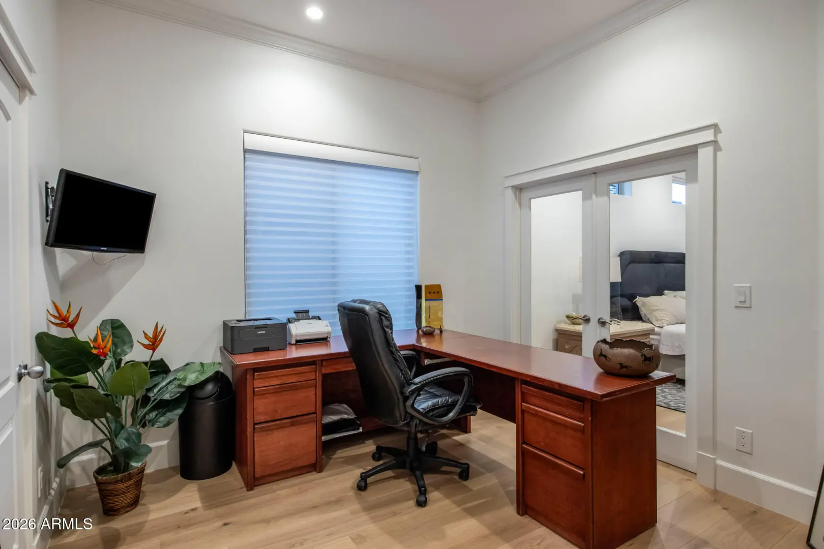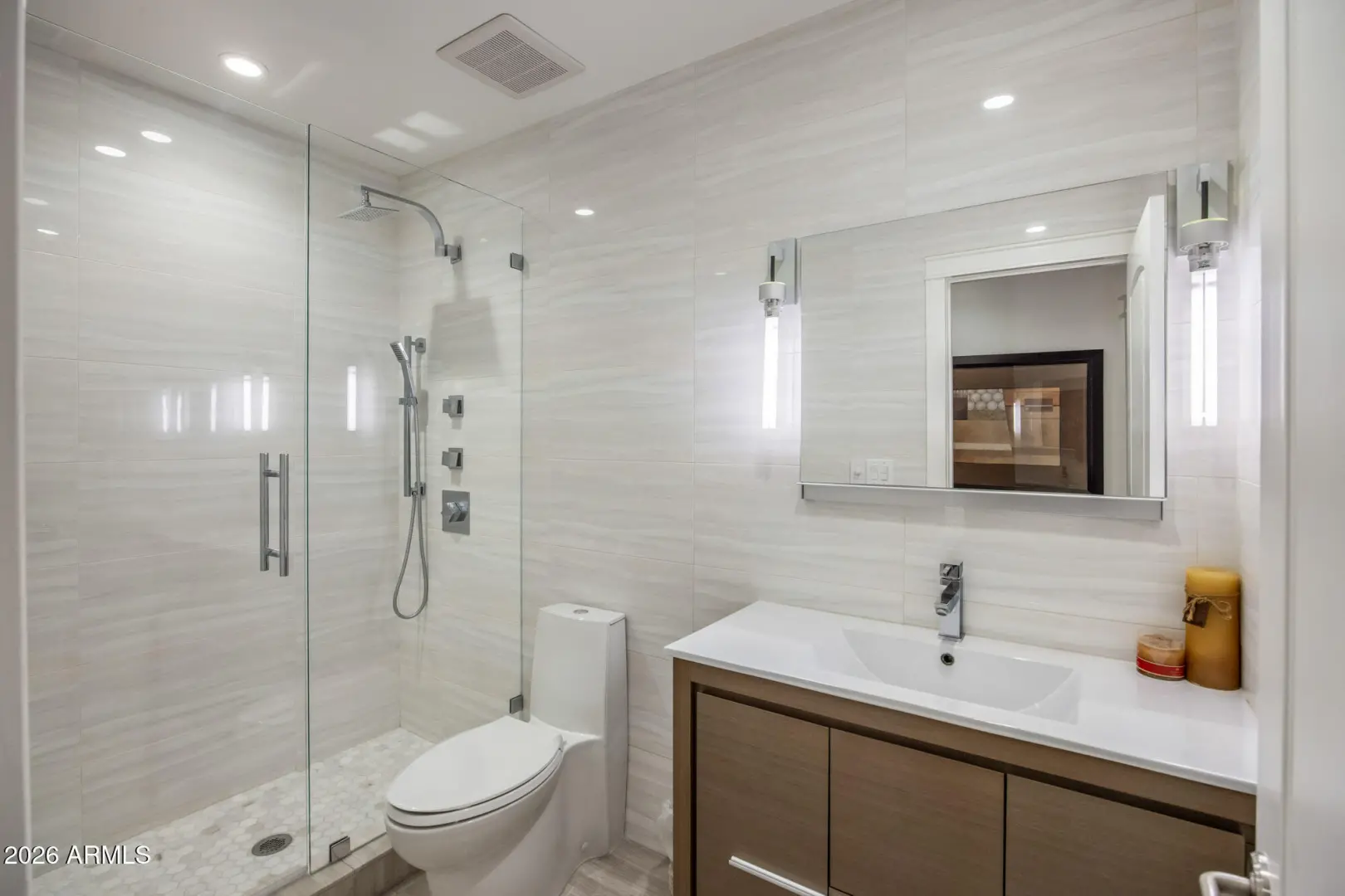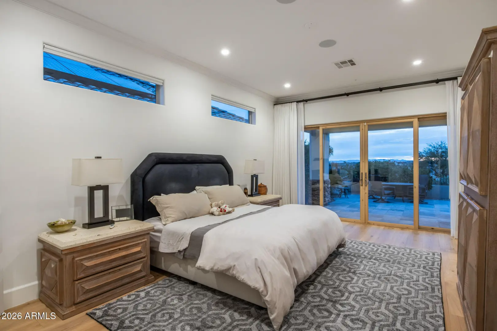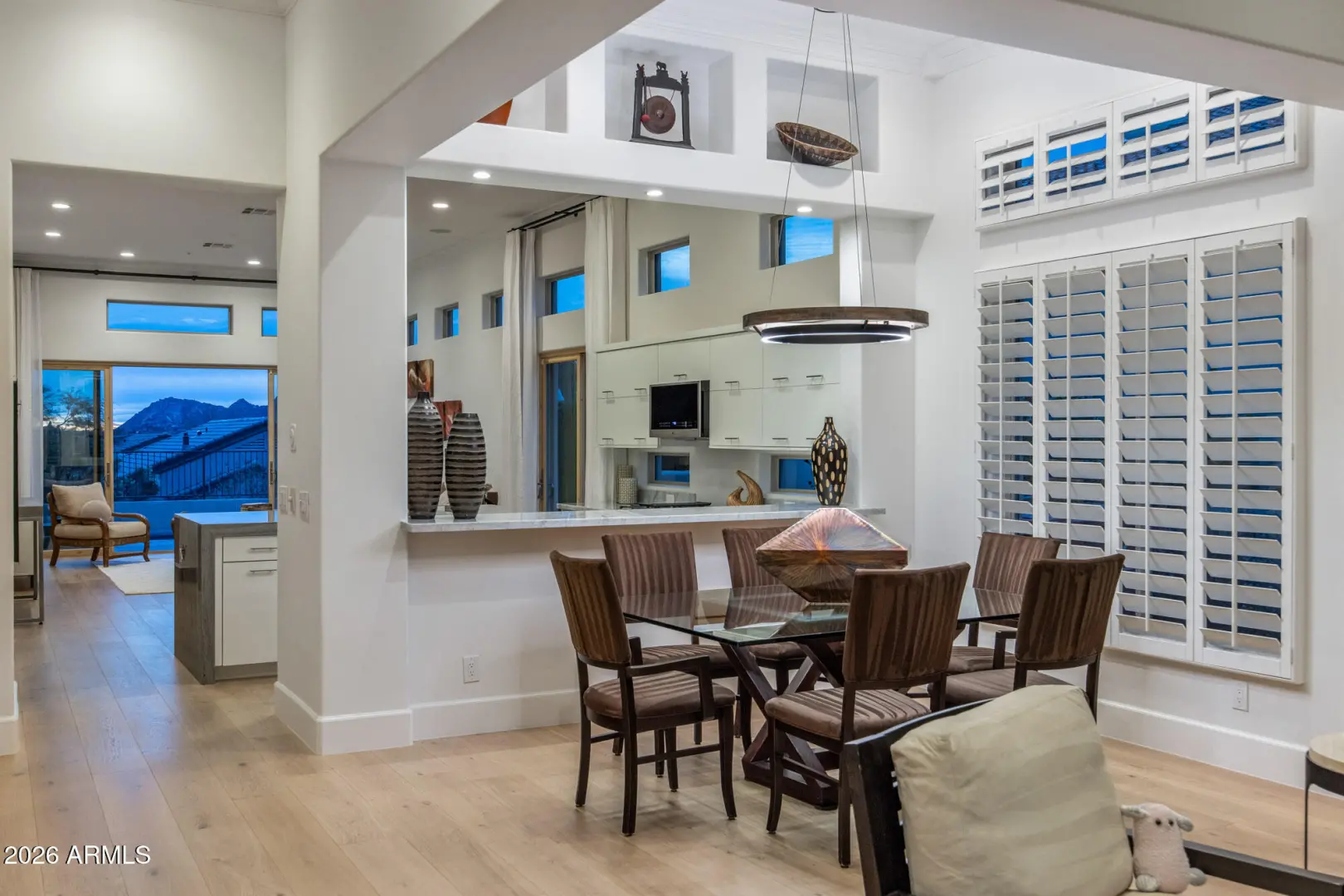 Perched on an elevated view lot with sweeping vistas of Troon Mountain and Four Peaks, this 3-bedroom, 2.5-bath residence has been beautifully transformed with over $600k in upgrades into a contemporary showpiece, defined by modern finishes and refined detail. A fresh, neutral palette sets the tone in the open-concept great room, where soaring ceilings, wide-plank wood flooring, wide baseboards, and a stone-surround fireplace create an inviting, upscale ambiance. The remodeled kitchen anchors the home with sleek flat-panel cabinetry, quartz countertops, stainless-steel appliances, a wine fridge, gas cooktop, and a generous island with breakfast bar—perfect for effortless entertaining. Natural light pours in through high-efficiency tinted windows, while expansive sliding glass walls in