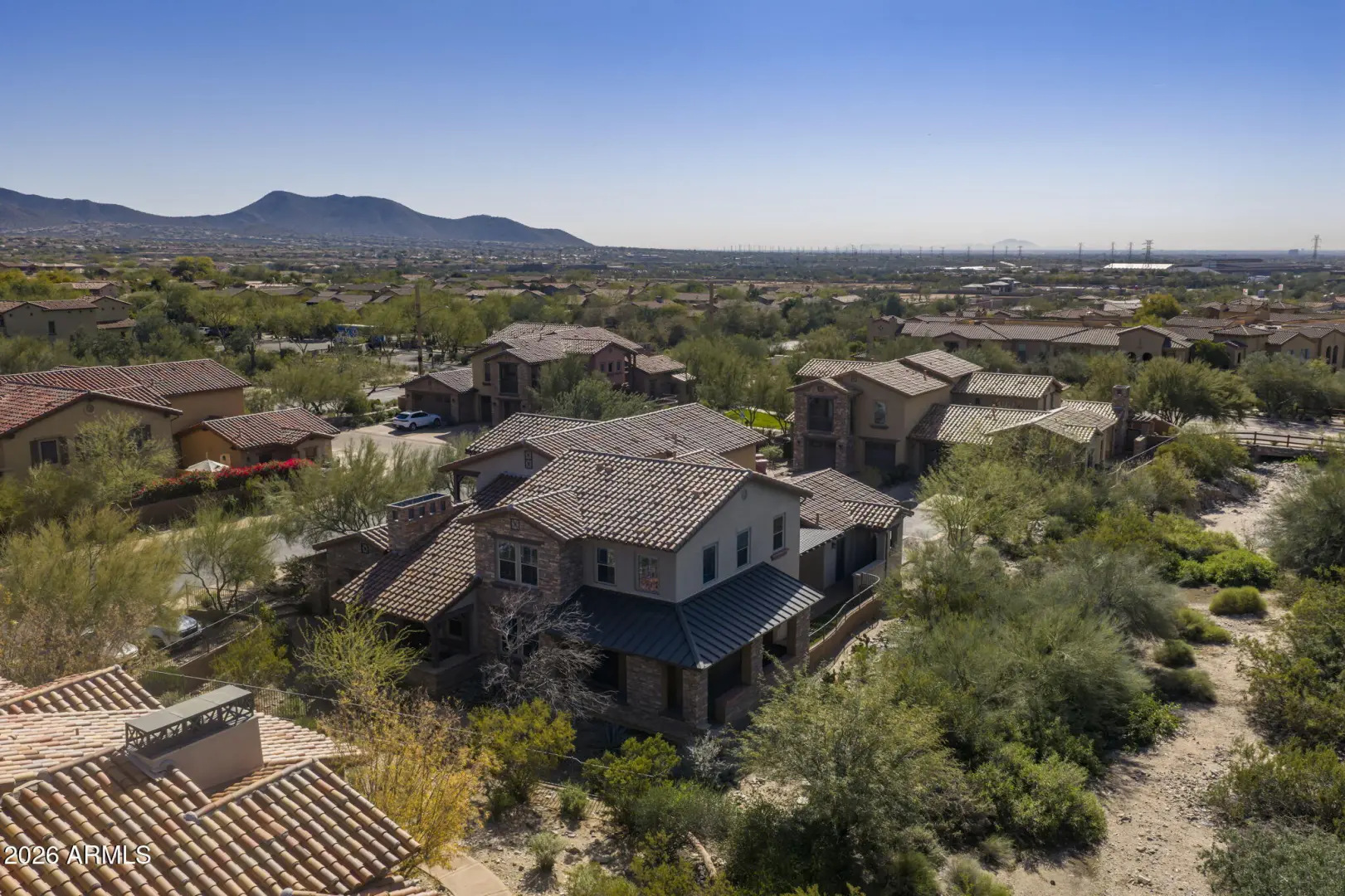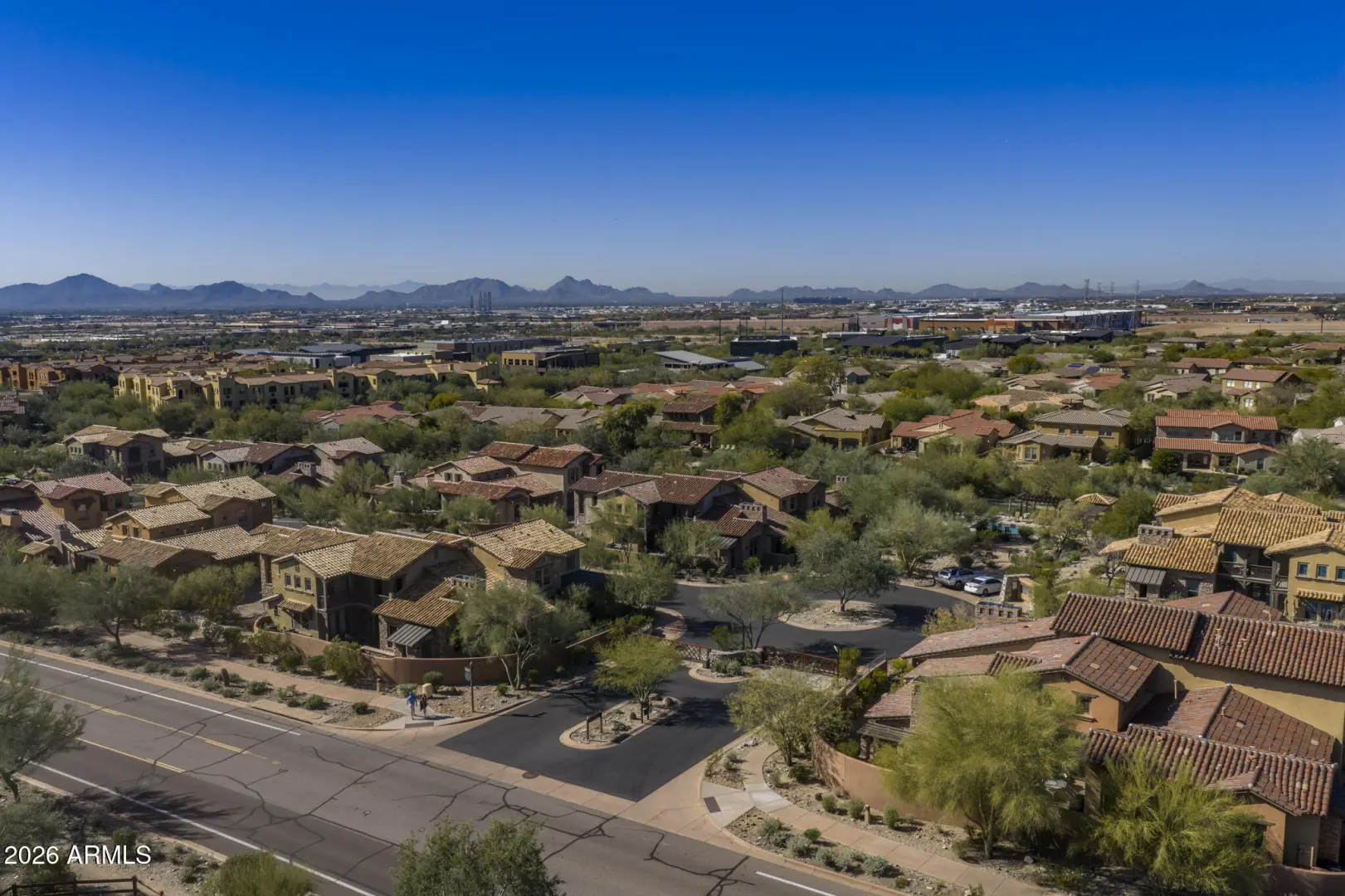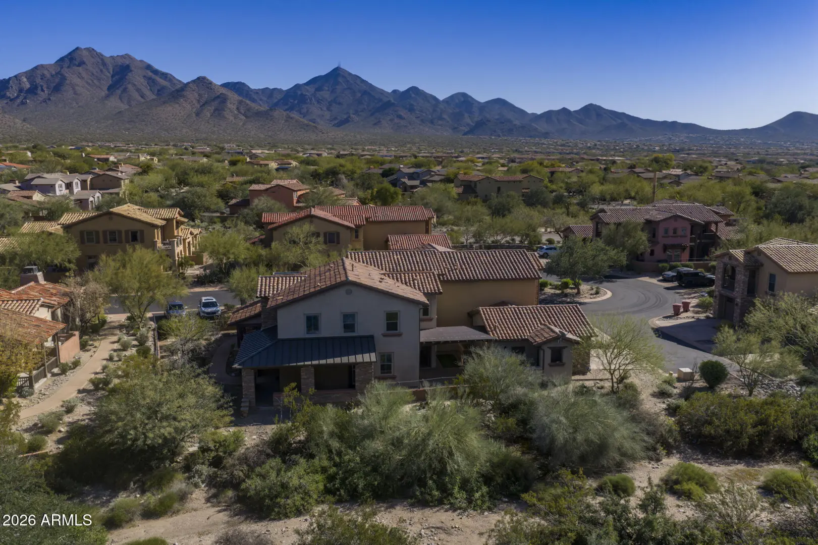 Villas at Desert Park Village DC Ranch / This Luxury Townhome in the Premier gated DC Ranch community wins the location as it borders the Desert Wash / Very private wrap around paver courtyard patio nestled at the end of the cul-de-sac! Desert Camp Community Center; Clubhouse, Fitness Center, Tennis & Pickleball Courts & Pools in addition enjoy the Homestead Community Center. Close proximity to Hiking & Biking Trails. Large Master Bedroom / Walk-In Custom Closet / separate Tub/Tiled Shower / Double Sinks / Den area / lots of Windows shed light throughout. Gourmet Kitchen with island counter seating.