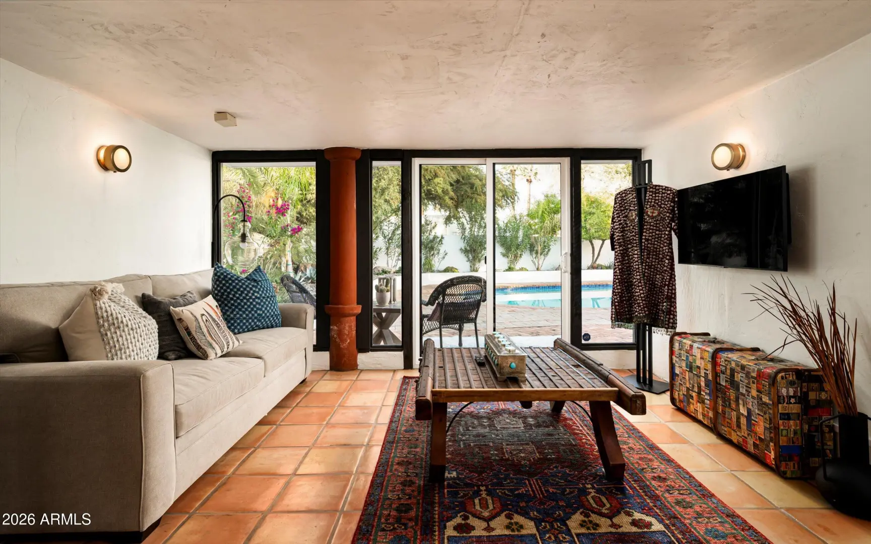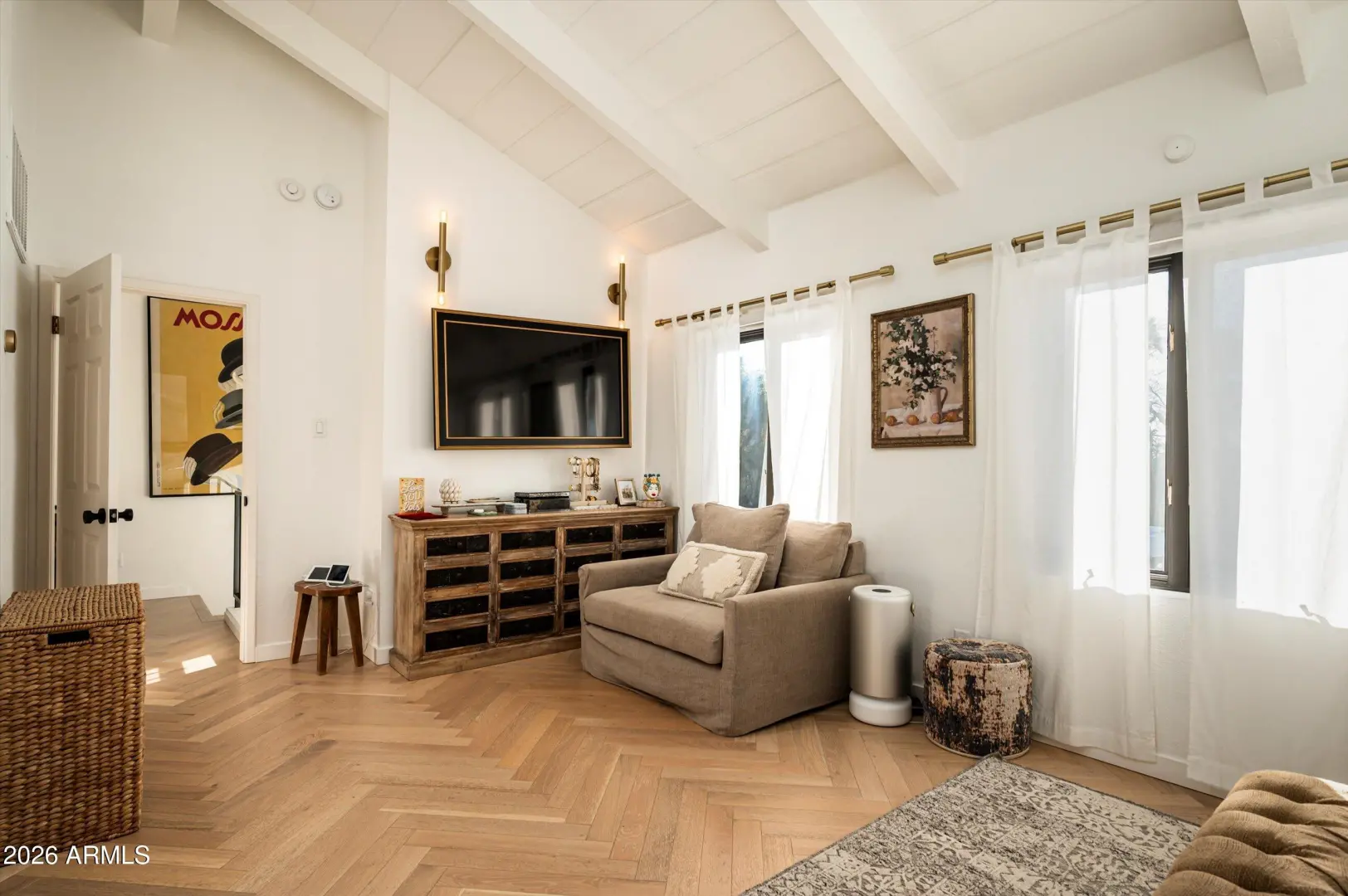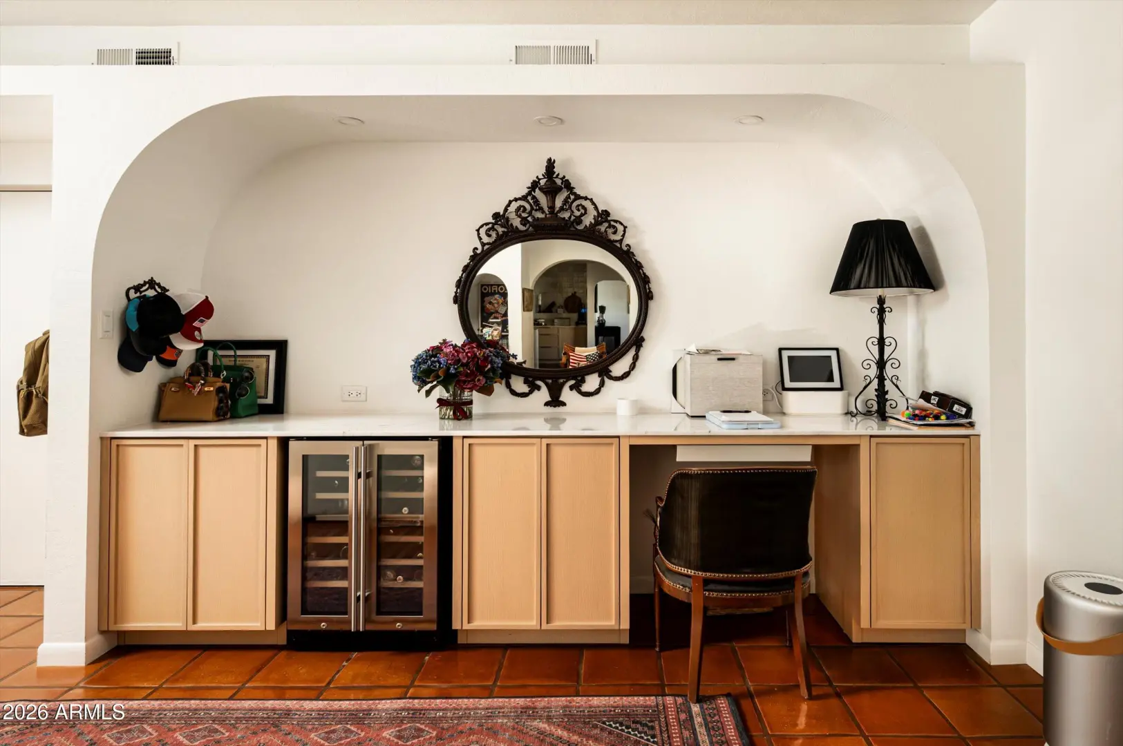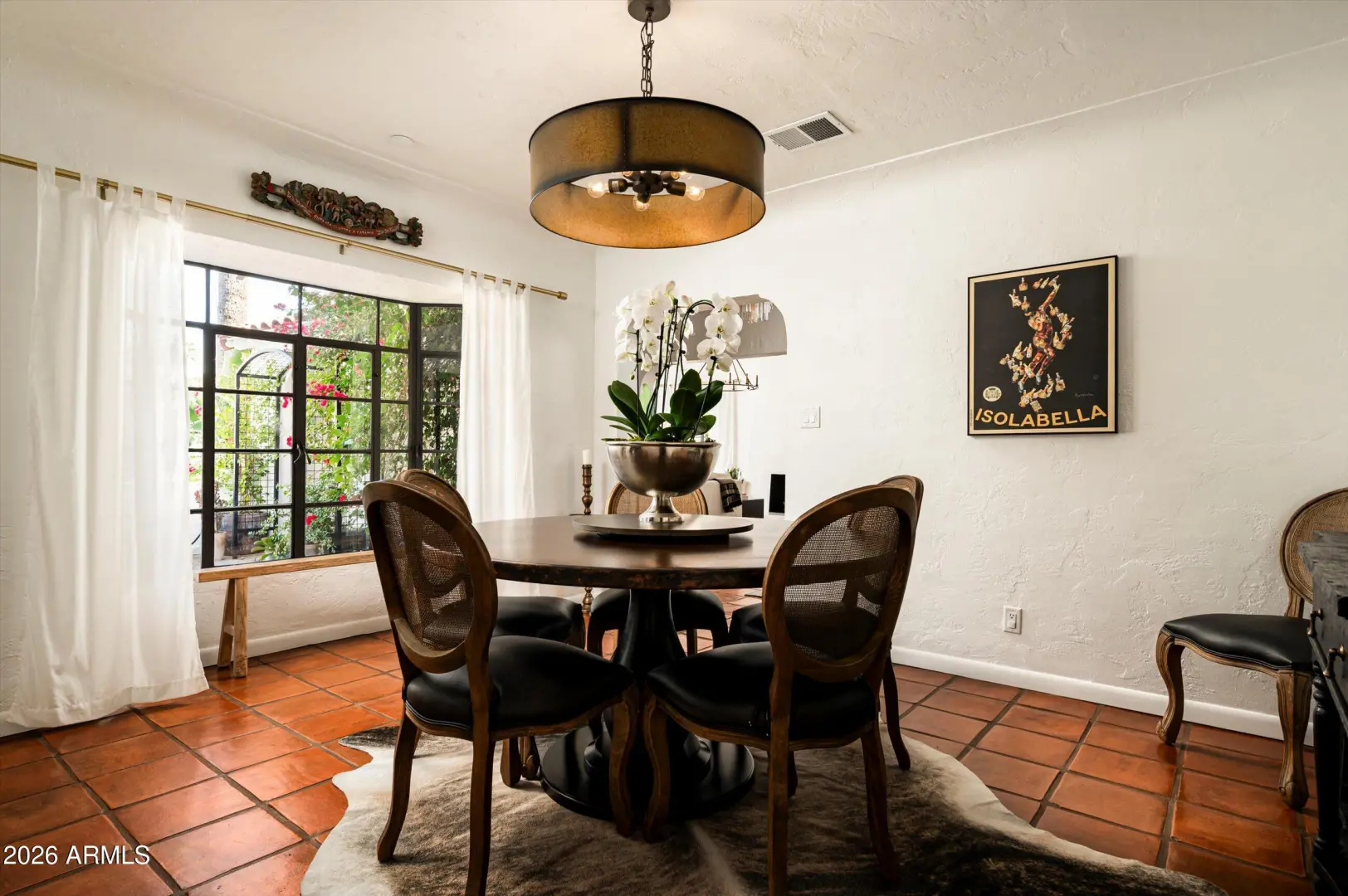 Villa Palmera a quintessential Spanish Revival residence a study in warmth, craft, and enduring character, set within one of the area's most storied historic neighborhoods. From the moment of arrival, lush landscaping frames the home with a sense of romance and quiet retreat, creating an atmosphere that feels both intimate and established. Inside, Saltillo patterned flooring, plaster finish fireplace and distinctive light fixtures act as sculptural moments, chosen not only to illuminate but to elevate each space. The kitchen is both a focal point and a gathering place, layered with tactile beauty and natural light. Handcrafted zellige tile forms a luminous backsplash, its subtle variation adding depth and character behind marble countertops that feel timeless and refined.