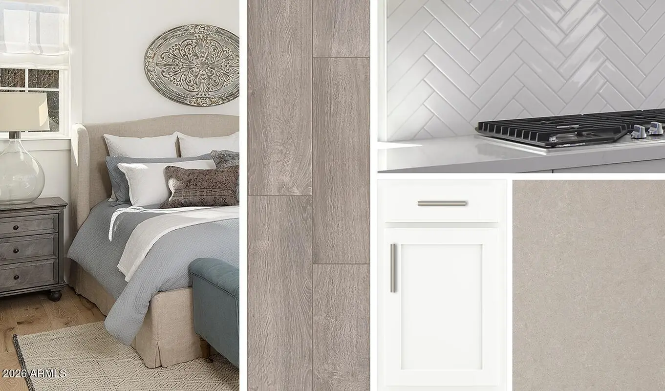 Brand new community in Surprise! This stunning single story home offers 1,949 sq ft of functional living space. It features 3 bedrooms, 2.5 bathrooms, den, and a 2-car garage. The open concept kitchen is perfect for entertaining and features an Island, a walk-in pantry and stainless steel appliances. It also offers our Timeless Collection which includes white 42'' cabinets, ivory white quartz kitchen countertops, herringbone mosaic white tile kitchen backsplash, and 7x22 wood looking plank tile in all the common areas. The great room offers a large sliding glass door so you can step out into your covered patio to enjoy indoor/outdoor living in your backyard with friends and family. The primary suite has a spacious walk-in closet, double sinks, walk-in shower, and an additional linen close