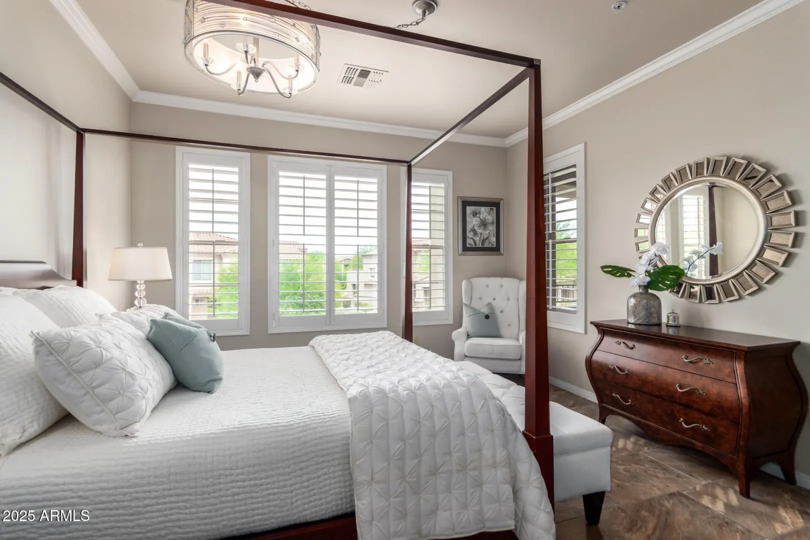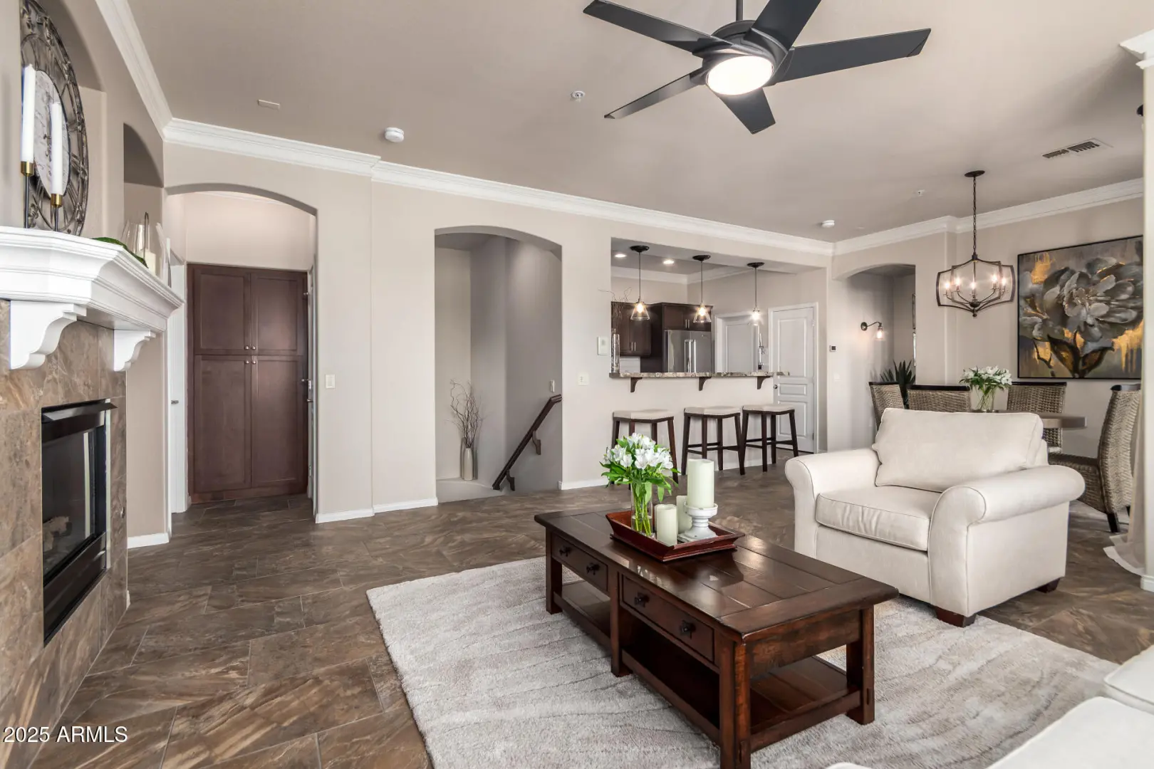 Welcome to this stunning, highly upgraded, move-in ready townhome nestled in the prestigious gated community Tesoro at Grayhawk. Featuring all tile flooring with no carpet, this immaculate home offers a sleek and stylish design throughout. The open floor plan is enhanced by beautiful shutters and crown molding, creating a bright and inviting atmosphere in every room. The kitchen is complete with stainless steel appliances, gas range, and upgraded finishes. Two large bedrooms with walk-in closets and a two-car garage with epoxy floors and extra storage. New water heater and the community just installed new roofs and exterior paint. Community amenities include a state-of-the-art fitness center, heated pool and spa, clubhouse, and beautifully maintained grounds. Perfect for a lock and leave