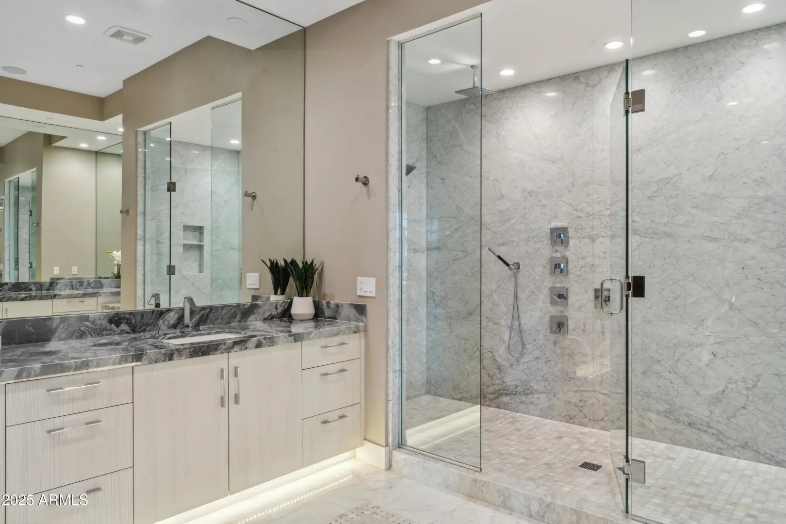 ***** PENTHOUSE UNIT — NO SHARED WALLS ***** A truly rare offering, this top-floor residence lives like a private home in the sky, with no neighboring walls, only 2 units below, and a private entry as the sole home on its hallway. Perched in one of Phoenix's most exclusive gated communities, this luxurious penthouse captures breathtaking views of the city skyline, surrounding mountains, and golf course fairways. Encompassing 3,950 square feet of elevated living space, the home features 3 bedrooms, a dedicated office, 3.5 bathrooms, a private storage room, and three garage parking spaces. Inside, wide-plank bleached oak flooring anchors the open-concept layout. The chef's kitchen is outfitted with Sub-Zero and Wolf appliances,