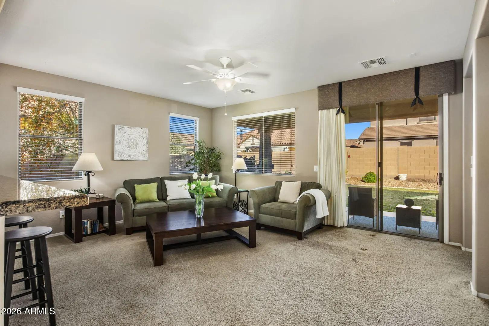 Set on a cul-de-sac close to top-rated schools, this 4 bedroom home offers 9' ceilings, tile flooring, recessed lighting, and surround sound wiring. The spacious kitchen has a pantry, stainless steel appliances, breakfast bar, and tall 42'' cabinets. The primary suite includes a separate exit to the backyard, dual sinks, a large walk-in closet, and separate tub and shower. Outside, the backyard features real grass, fruit trees, a covered patio, and a seperate pavered seating area. Just minutes from shopping, dining, parks, and all the amenities that make Queen Creek one of the East Valley's most desirable suburbs!
