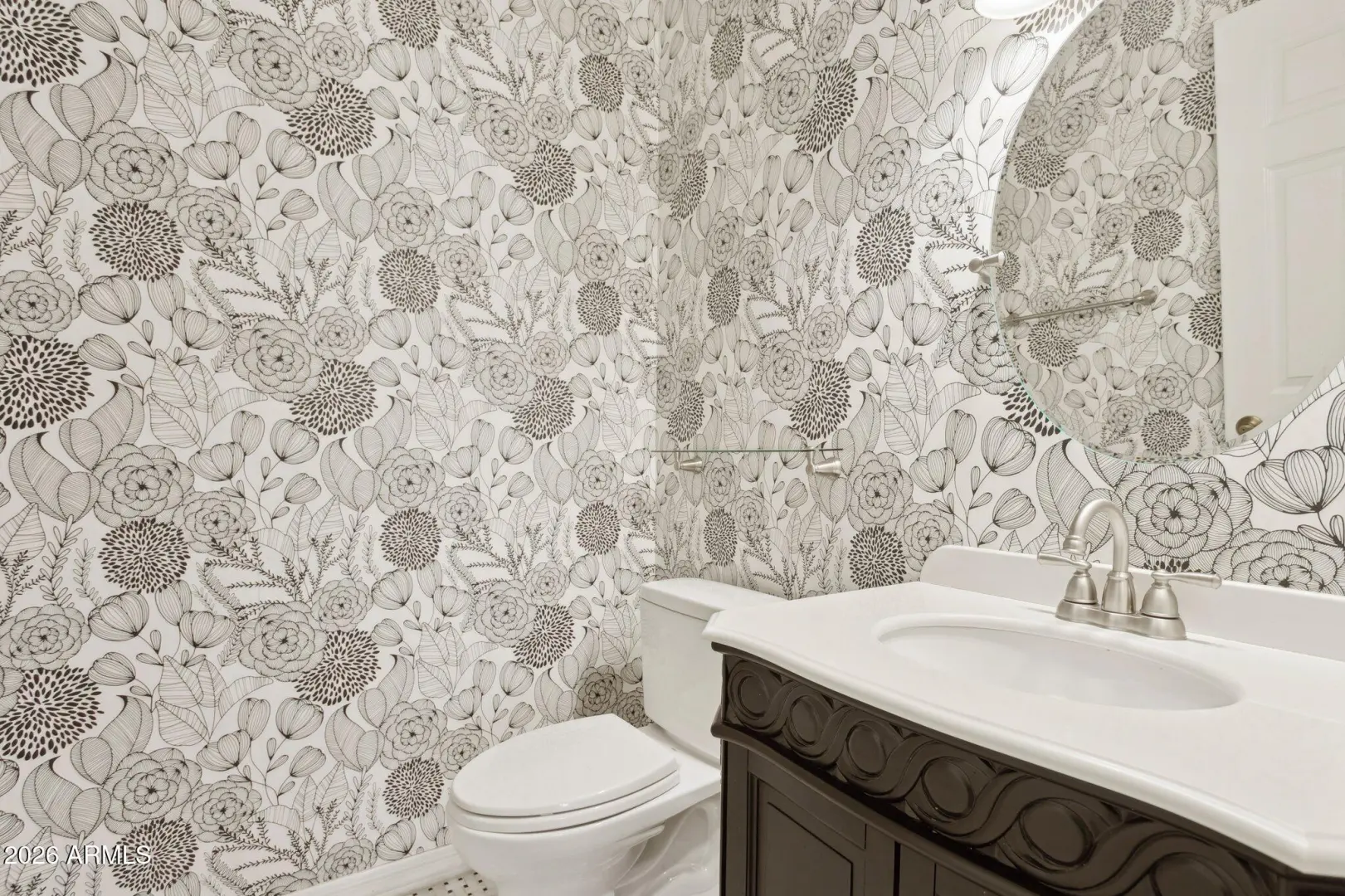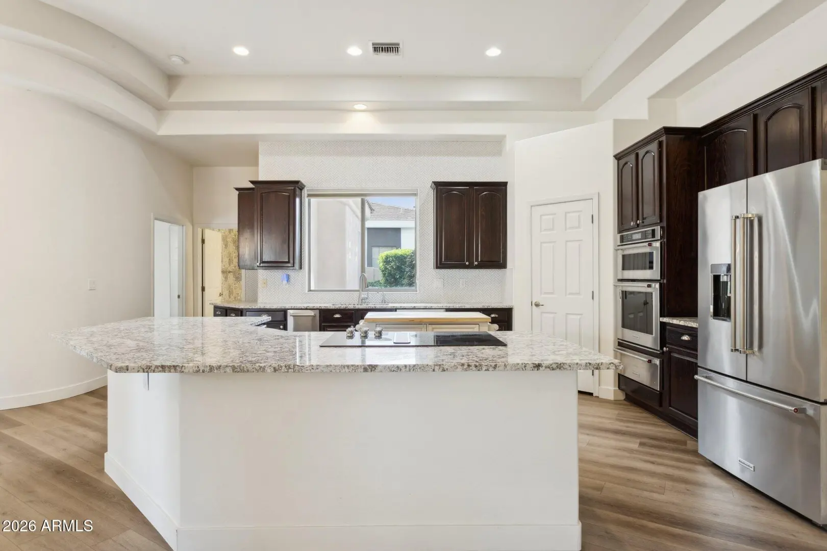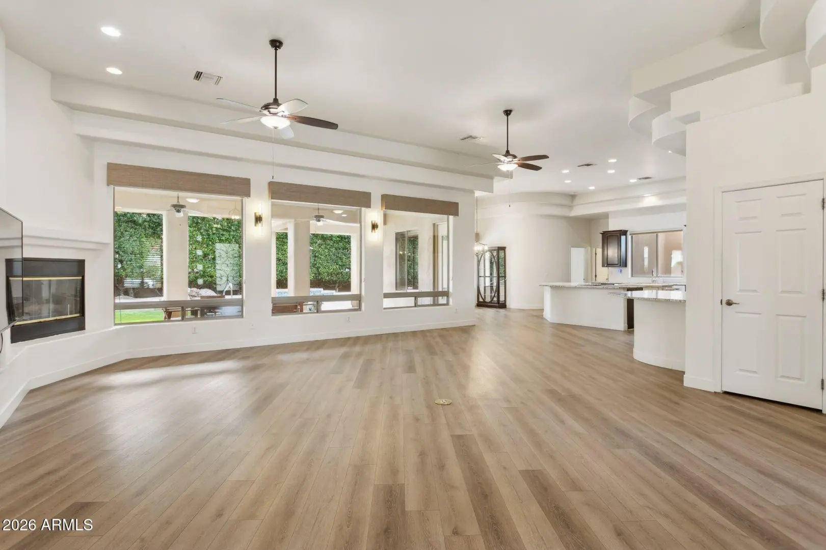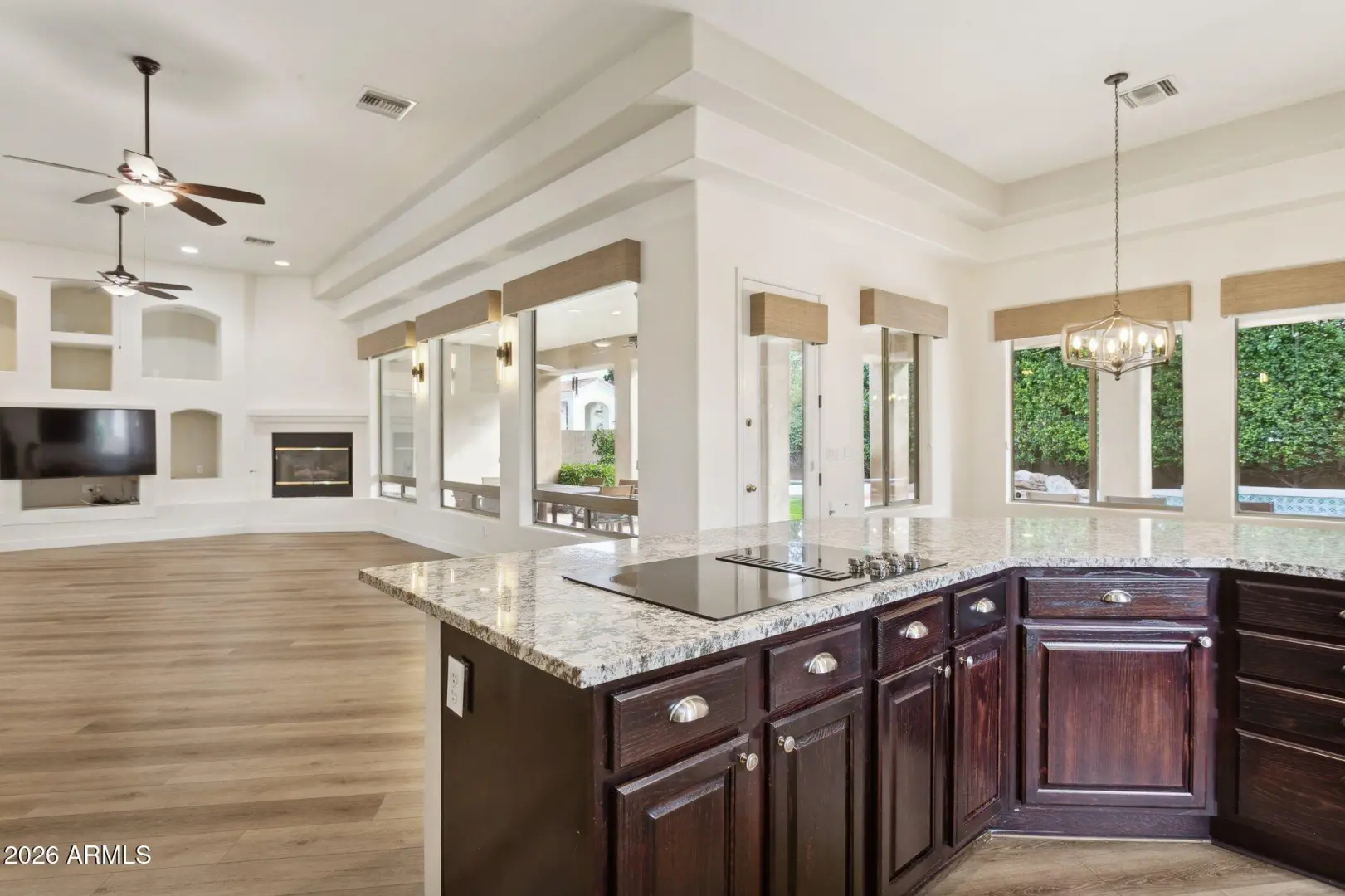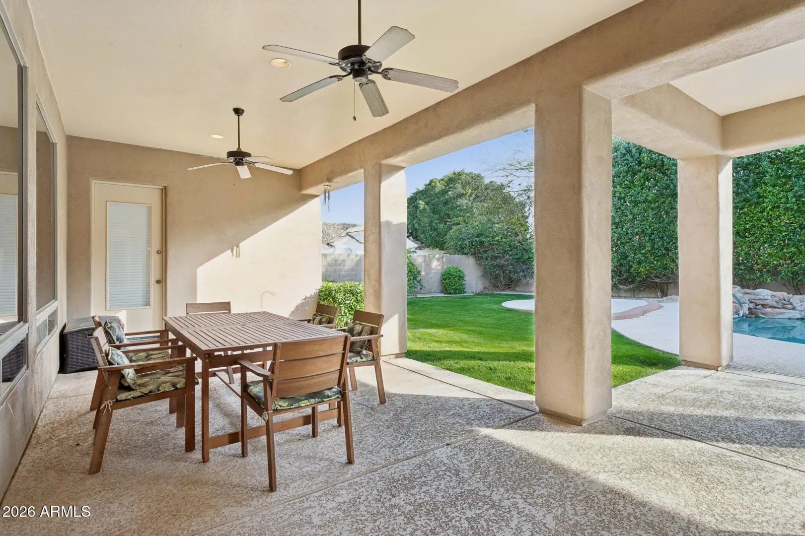 Welcome to The Groves of Hermosa Vista, where this home delivers that quintessential Arizona estate feel. From the street, the classic stucco exterior and tile roof are framed by a lush, green front lawn and mature citrus trees, all leading to a grand arched entry that immediately welcomes you. Inside, you'll find a layout built for real life—generous storage, comfortable gathering spaces, and room for everyone. The oversized kitchen anchors the home, featuring a large center island and an eat-up bar, and the laundry room is thoughtfully designed with a sink and ample storage. But the backyard is where this property truly shines: a resort-style landscape with a huge diving pool that feels like summer at home. Pair this with the large covered patio, and you've