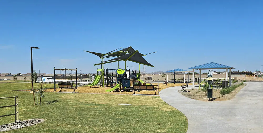 Take a look at this brand-new 3-bedroom, 2-bathroom home located in the beautiful community of Wales Ranch in San Tan Valley. Designed with comfort and functionality in mind, it features a spacious layout enhanced by a large 4-panel sliding door that opens to your private backyard--perfect for relaxing or entertaining. The primary suite offers double sinks, an enlarged shower and walk-in closet to simplify your morning routine. This home also includes 8-foot interior doors, a rough-in for a soft water loop, and comes complete with a washer, dryer, refrigerator, and blinds throughout. Stylish white 42'' cabinets, quartz countertops, and a matching backsplash from the Harmony Collection pair beautifully with wood-style ceramic tile flooring, creating a seamless, neutral look. Residents of