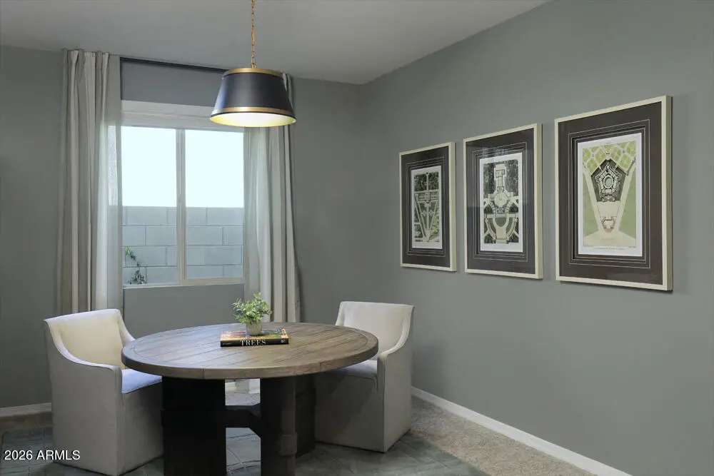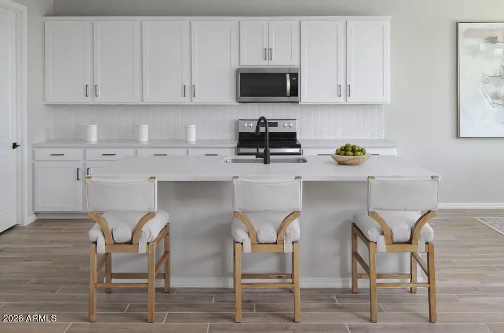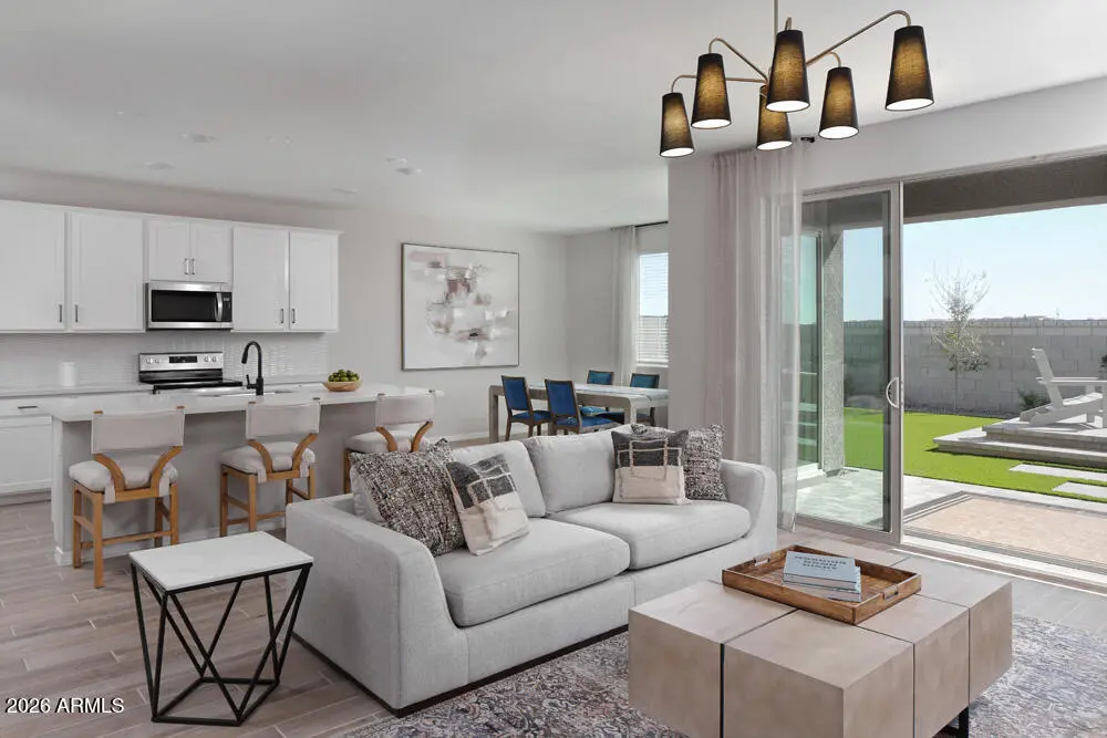 Model Home for Sale! Model furniture available to purchase in addition to list price. Nestled in the heart of San Tan Valley, this 2,485-square-foot Topaz home offers three bedrooms, two and a half bathrooms, a den, and a spacious three-car tandem garage. Upon entry, you are greeted by a wide main hallway and a large foyer with convenient closet space. The open-concept design seamlessly flows into the heart of the home, where you'll find 8-foot doors and a striking 4-panel glass slider. The sliding doors open to a private backyard retreat, offering the perfect space for relaxation. The kitchen, a true centerpiece, features the Harmony Collection, including elegant quartz countertops, modern white cabinetry, a stylish backsplash, and stainless steel appliances. The primary