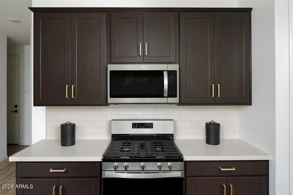 Stunning model home featuring the Sunflower floor plan in the sought-after Retreat at Aloravita by Ashton Woods. Loaded with custom interior design, upgraded accent lighting, designer paint and trim, quartz surfaces, espresso cabinetry, matte black and champagne bronze hardware, GE Profile appliances, 8' doors, and wood-look tile flooring. Enjoy seamless indoor-outdoor living with a 4-panel sliding glass wall to a fully landscaped designer backyard showcasing breathtaking mountain views. Complete with window coverings, washer, dryer, and refrigerator--this move-in-ready showcase home is the perfect blend of luxury, style, and comfort.