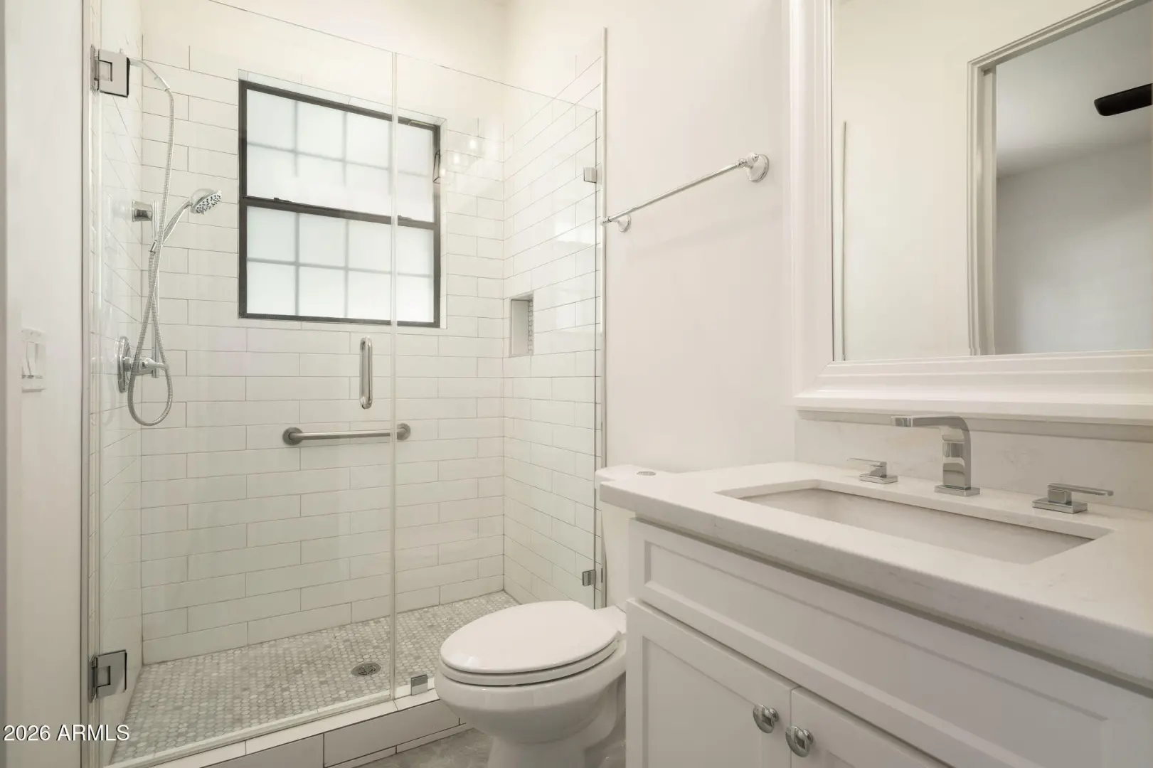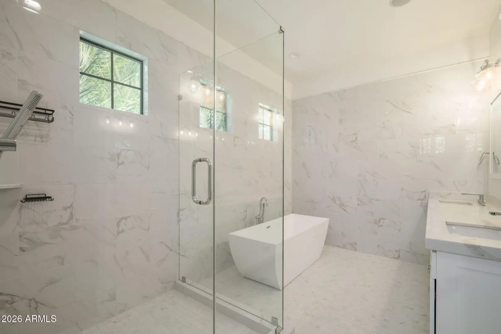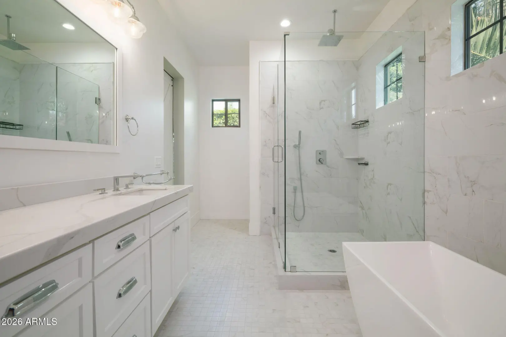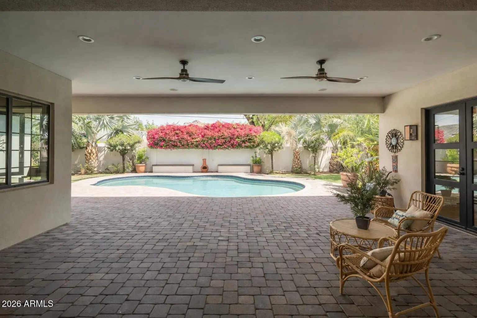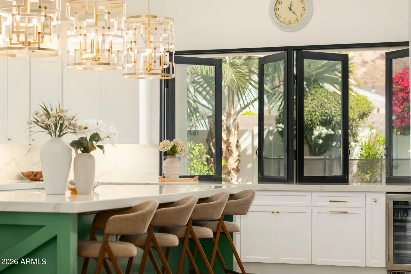 An iconic Dutch door welcomes you into this classic Arcadia home, where Camelback views frame the horizon. Soaring ceilings, timeless wood flooring, brick accent walls, and a custom fireplace with reclaimed wood mantel set the tone for sophisticated living. Two large primary suites have outdoor access, and the two additional en-suite bedrooms feature spacious walk-in closets. The kitchen boasts a 10-foot island, Thermador appliances, incorporated lighting, wine fridge, ample storage, and pass-through windows that open seamlessly to the back patio. The oversized sliders welcome you to your private oasis: covered patio, heated pool, and low-maintenance green spaces. This home reflects the charm and community the Arcadia neighborhood is known for!