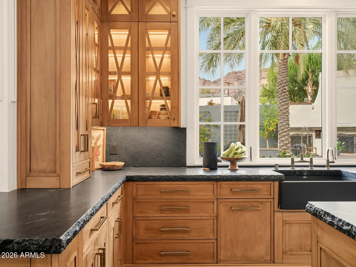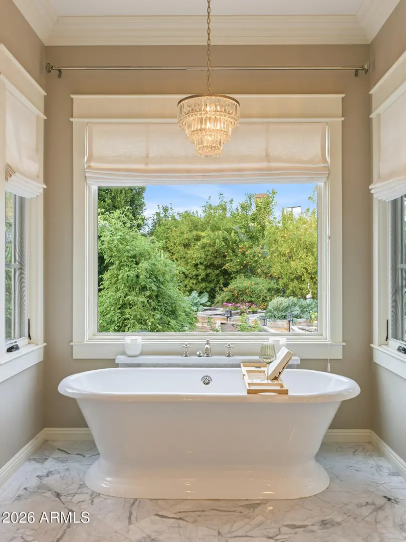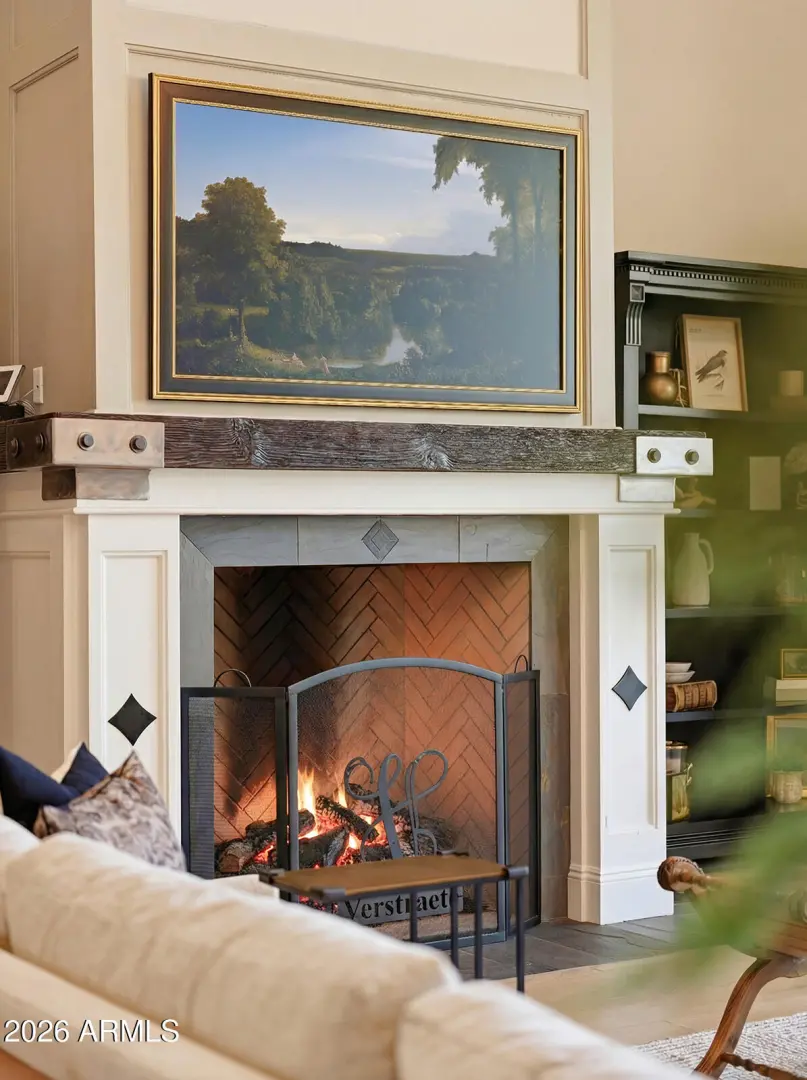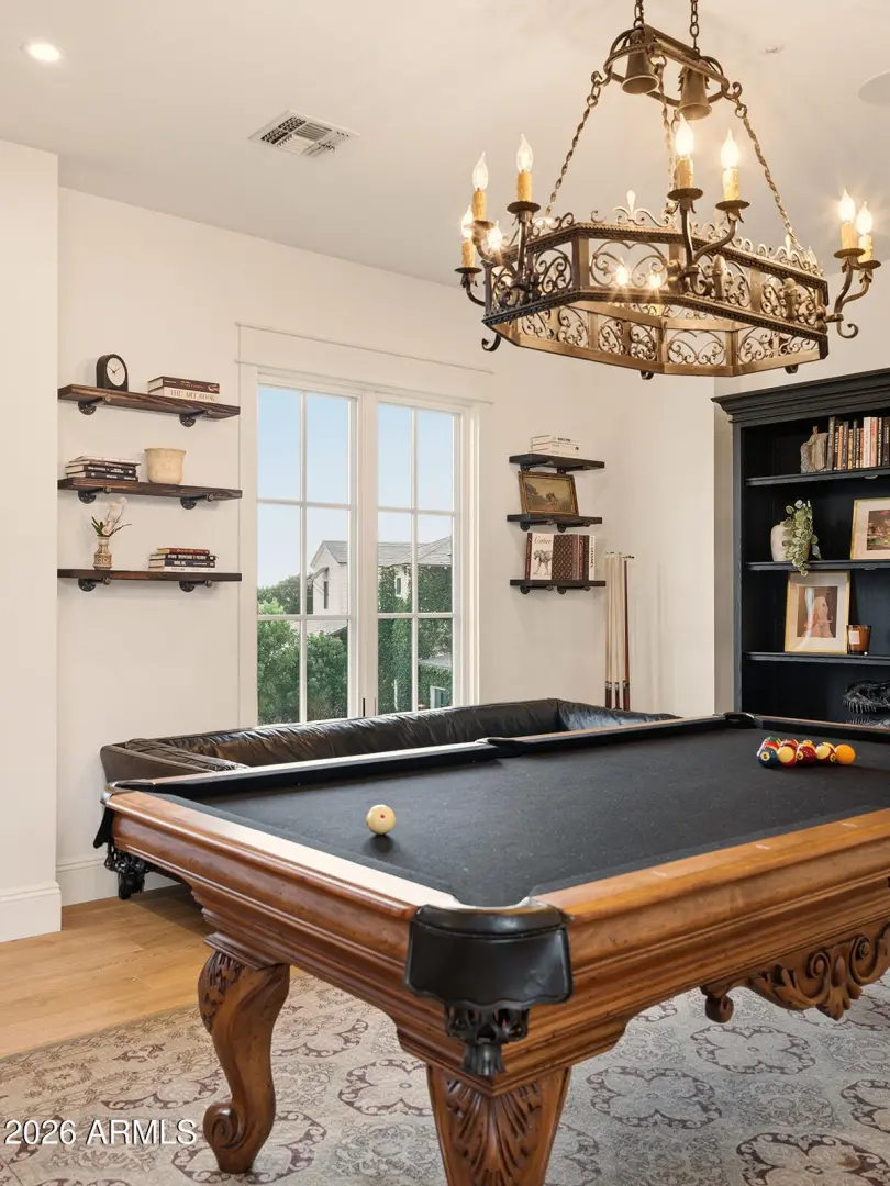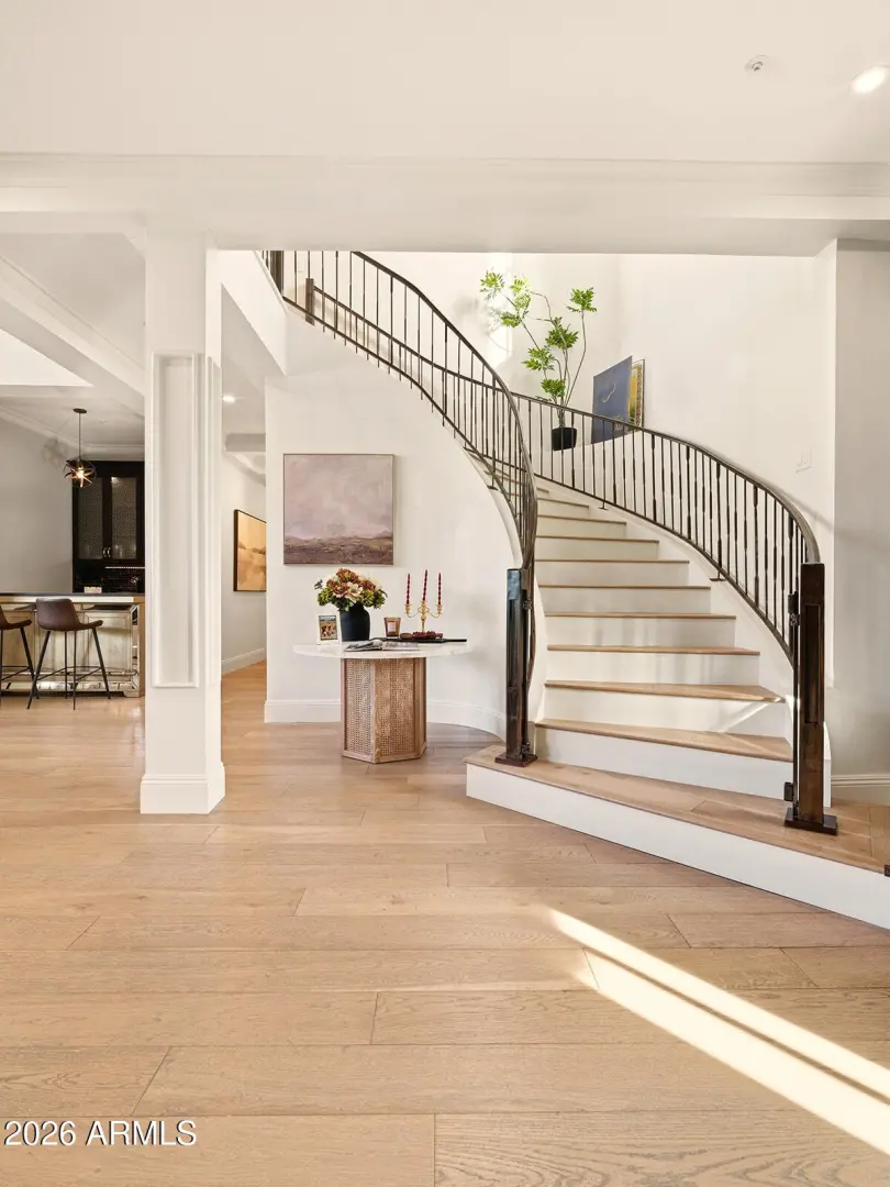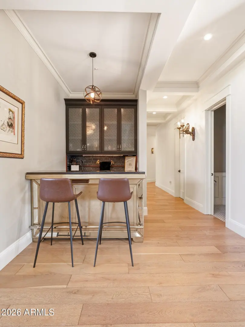 The home we experience as The Garden, rests quietly at the end of a cul-de-sac in one of Arcadia's most tightly held pockets. This estate feels both grounded and elevated, private in its placement, yet visually connected to Camelback Mountain, which rises as a constant backdrop. The approach is substantial, and intentional. Inside, volume and warmth coexist as soaring ceilings wrapped in tongue-and-groove detailing create rhythm, texture, and a sense of quiet drama. Walls of pocketing glass dissolve the boundary between indoors and out, pulling natural light deep into the home and framing the resort-like grounds beyond. The kitchen is designed as the center of gravity, less a room, more a gathering point. Custom cabinetry, a fabulous chiseled-edge granite island, and professional