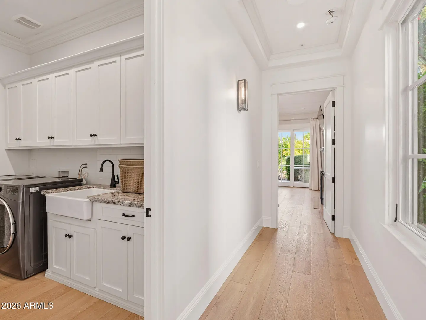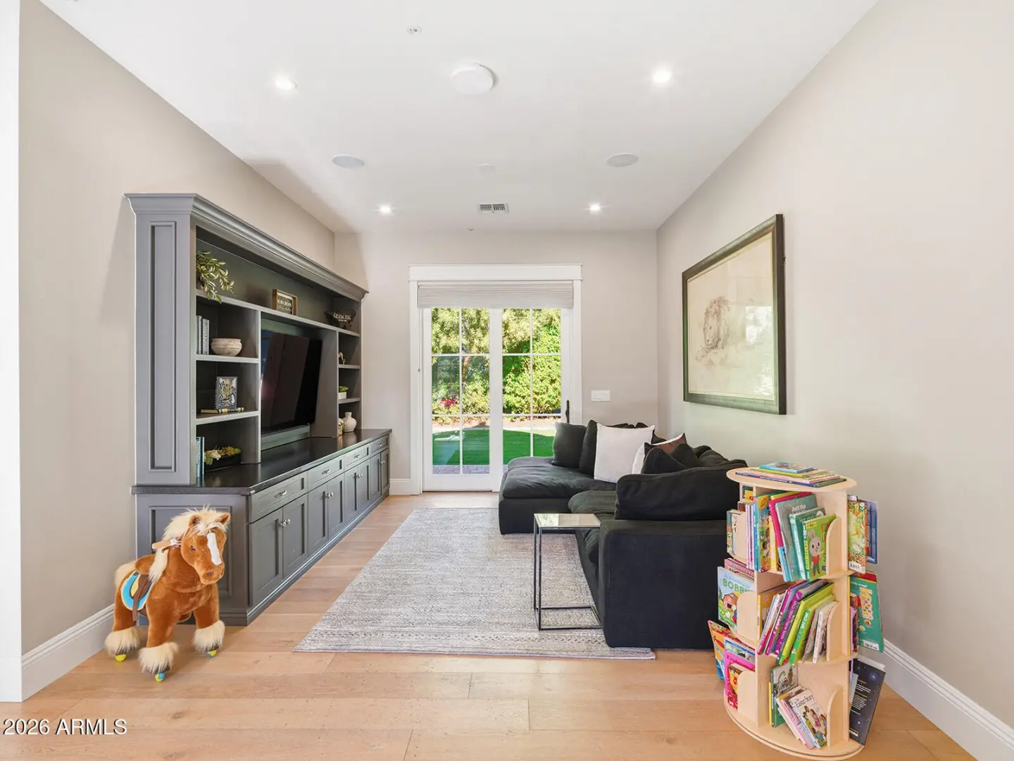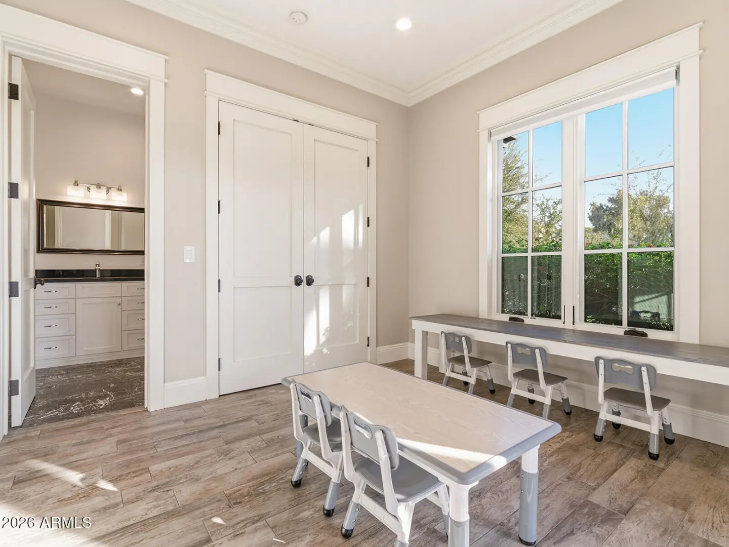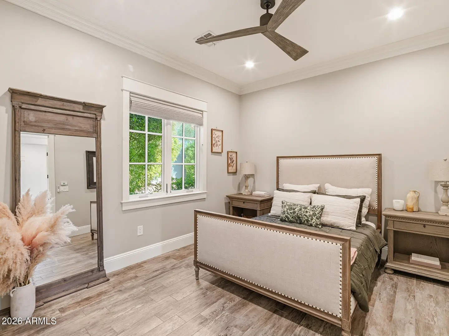 The home we experience as The Garden, rests quietly at the end of a cul-de-sac in one of Arcadia's most tightly held pockets. This estate feels both grounded and elevated, private in its placement, yet visually connected to Camelback Mountain, which rises as a constant backdrop. The approach is substantial, and intentional. Inside, volume and warmth coexist as soaring ceilings wrapped in tongue-and-groove detailing create rhythm, texture, and a sense of quiet drama. Walls of pocketing glass dissolve the boundary between indoors and out, pulling natural light deep into the home and framing the resort-like grounds beyond. The kitchen is designed as the center of gravity, less a room, more a gathering point. Custom cabinetry, a fabulous chiseled-edge granite island, and professional