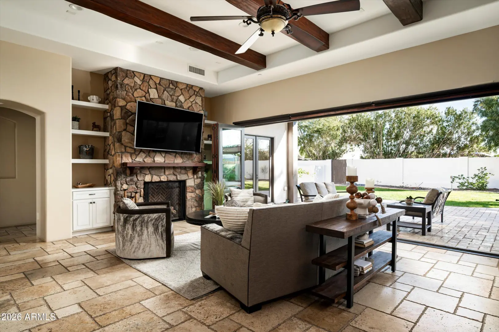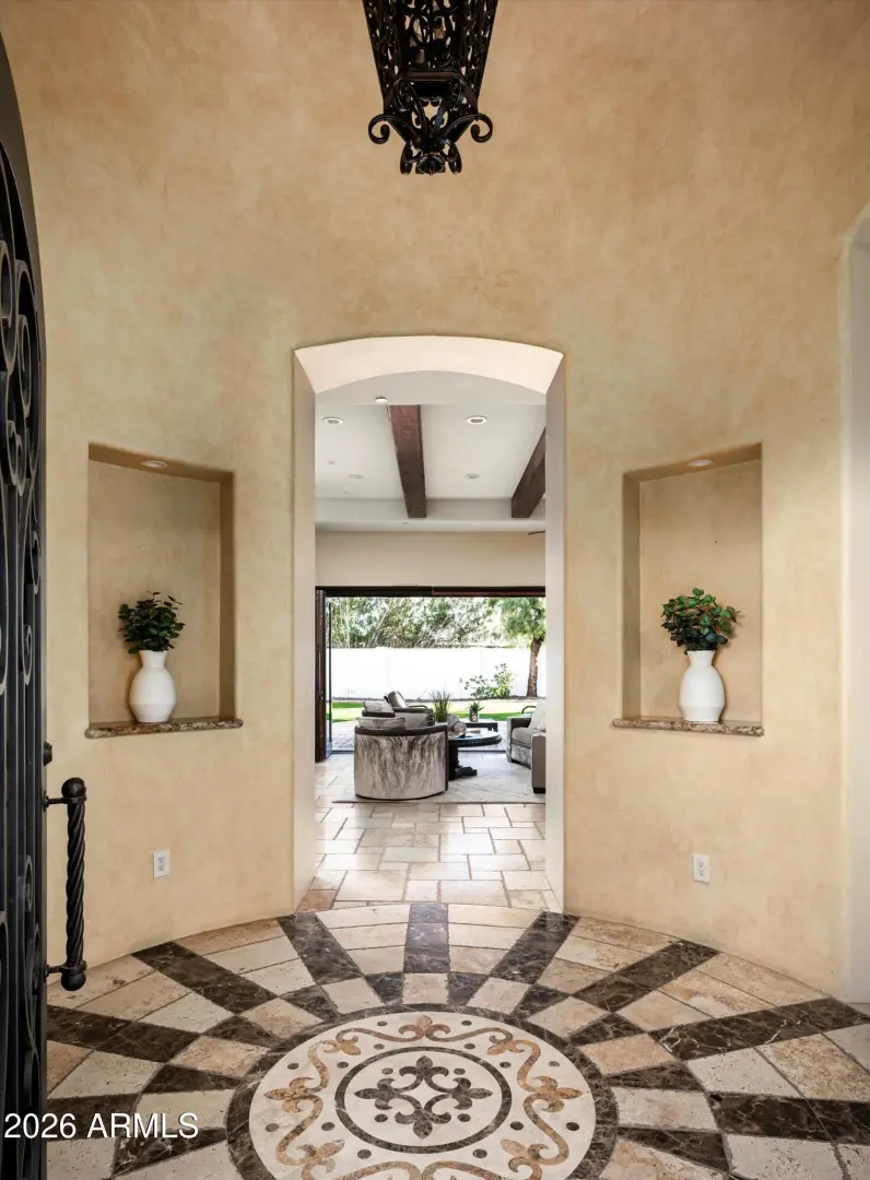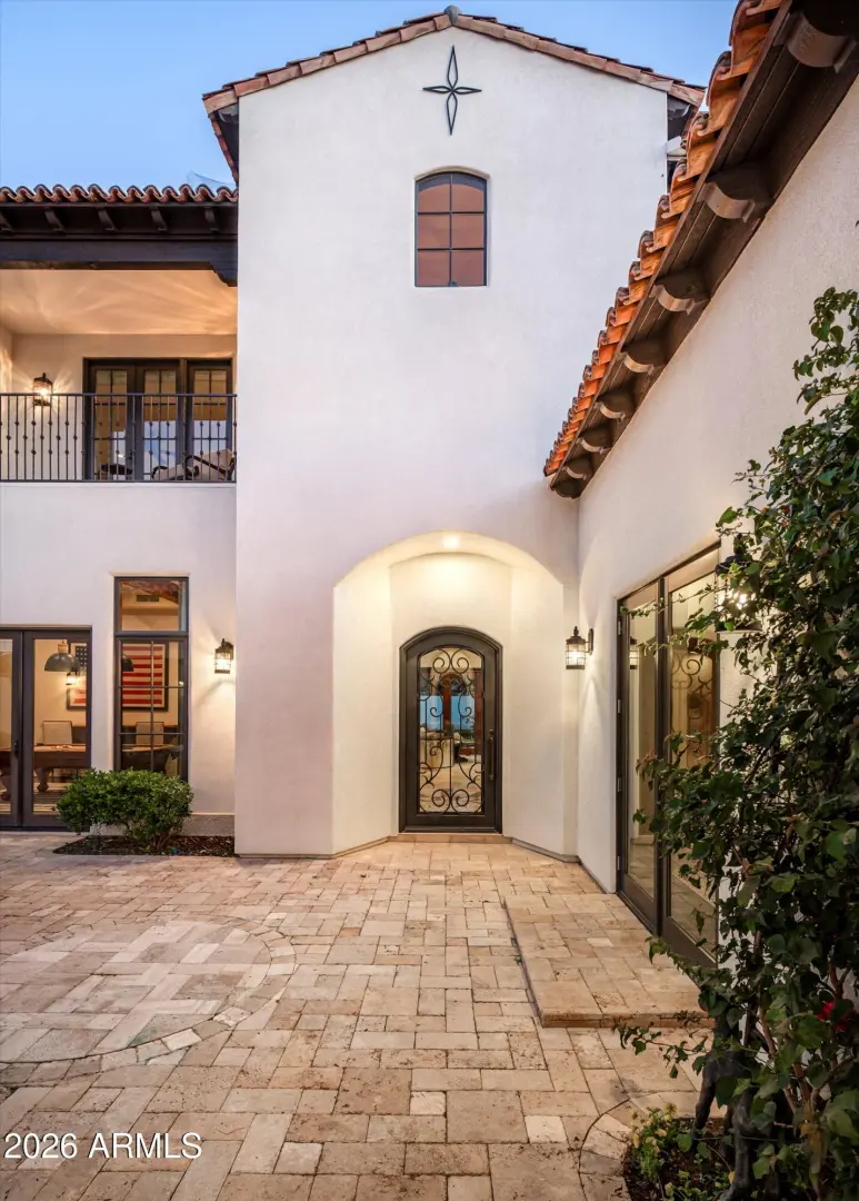 Stunning Mediterranean estate tucked within a coveted neighborhood near Arizona Country Club. This property offers timeless architecture and a thoughtful indoor and outdoor lifestyle. Featuring a private courtyard entry with water feature, creating a sense of arrival and privacy before stepping inside. The heart of the home centers around the gourmet kitchen featuring dual islands, generous prep space, and a layout that overlooks the great room and an inviting breakfast nook, making this ideal for both everyday living and entertaining. Expansive bi-folding glass doors open the main living areas to a large covered patio and lush grass area, creating a seamless transition for gatherings and relaxed outdoor enjoyment. A guest casita with separate entrance provides flexible accommodations