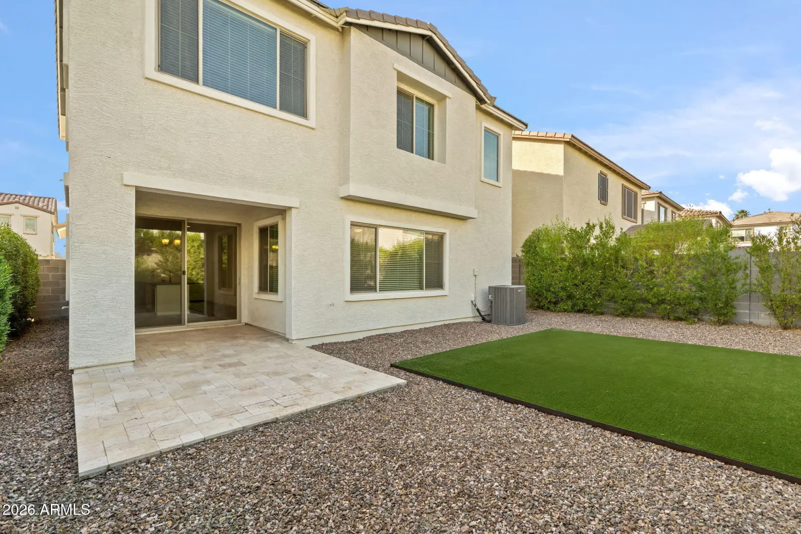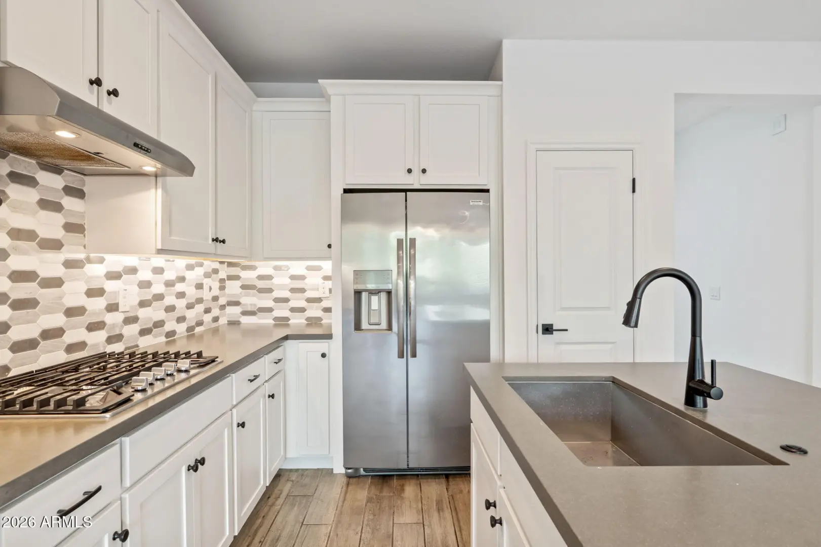 Beautifully upgraded 2022 Landsea home designed for today's buyers seeking low-maintenance outdoor living without sacrificing interior space. Wood-look tile flooring flows throughout the main level, leading to an open kitchen featuring quartz island seating, custom cabinetry, stainless appliances, gas range, and an easy connection to the spacious family room and dining area. Upstairs offers all three bedrooms plus a versatile loft/den perfect for a media space, home office, or study zone. The primary suite includes a generous walk-in closet and well-appointed bath, while the private backyard is thoughtfully finished with mature landscaping, turf grass, and a 10-foot privacy wall.