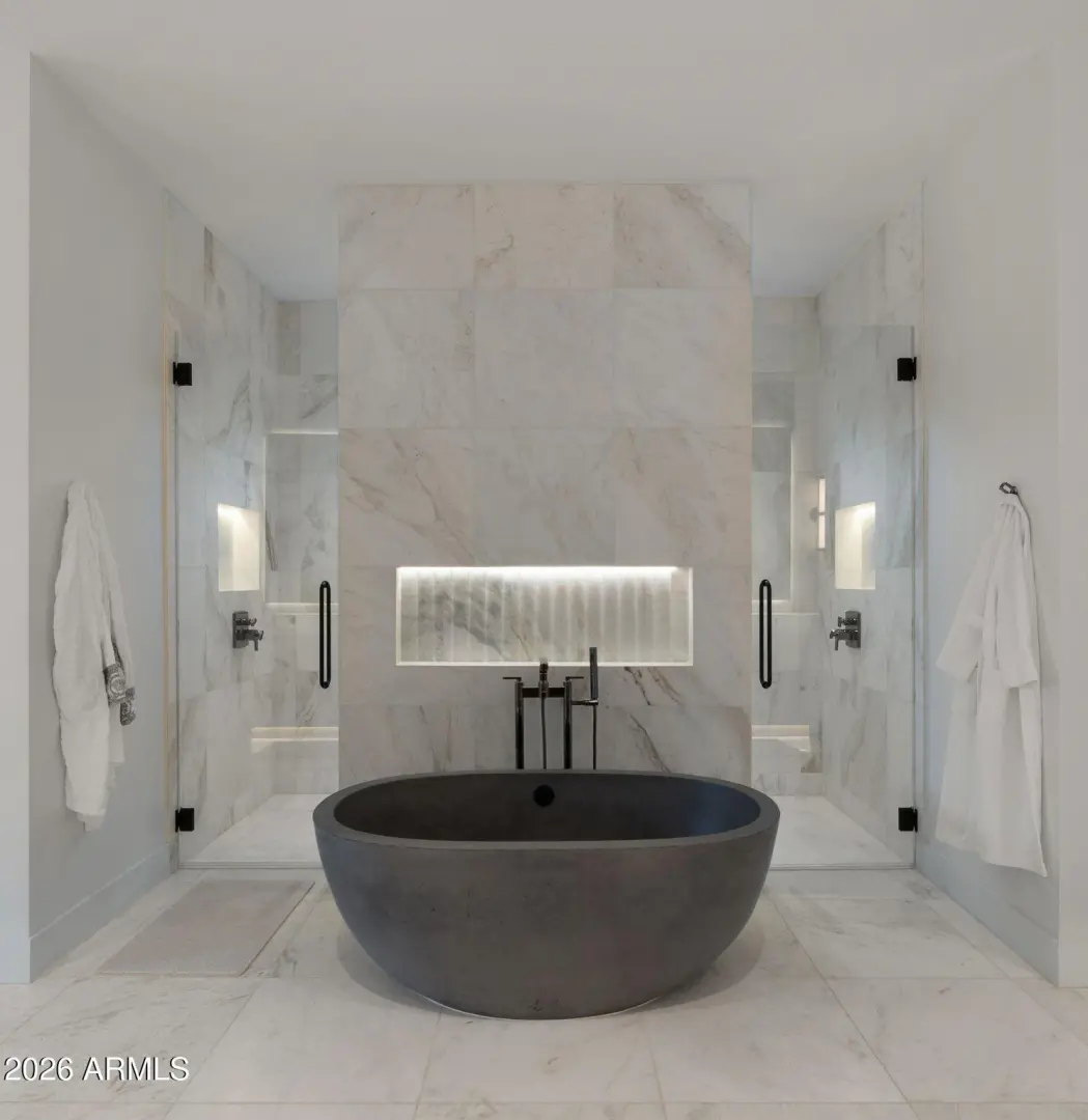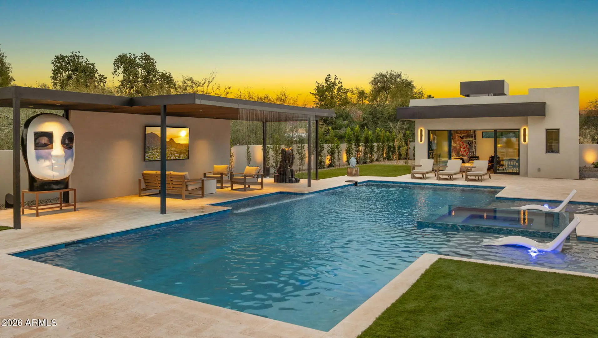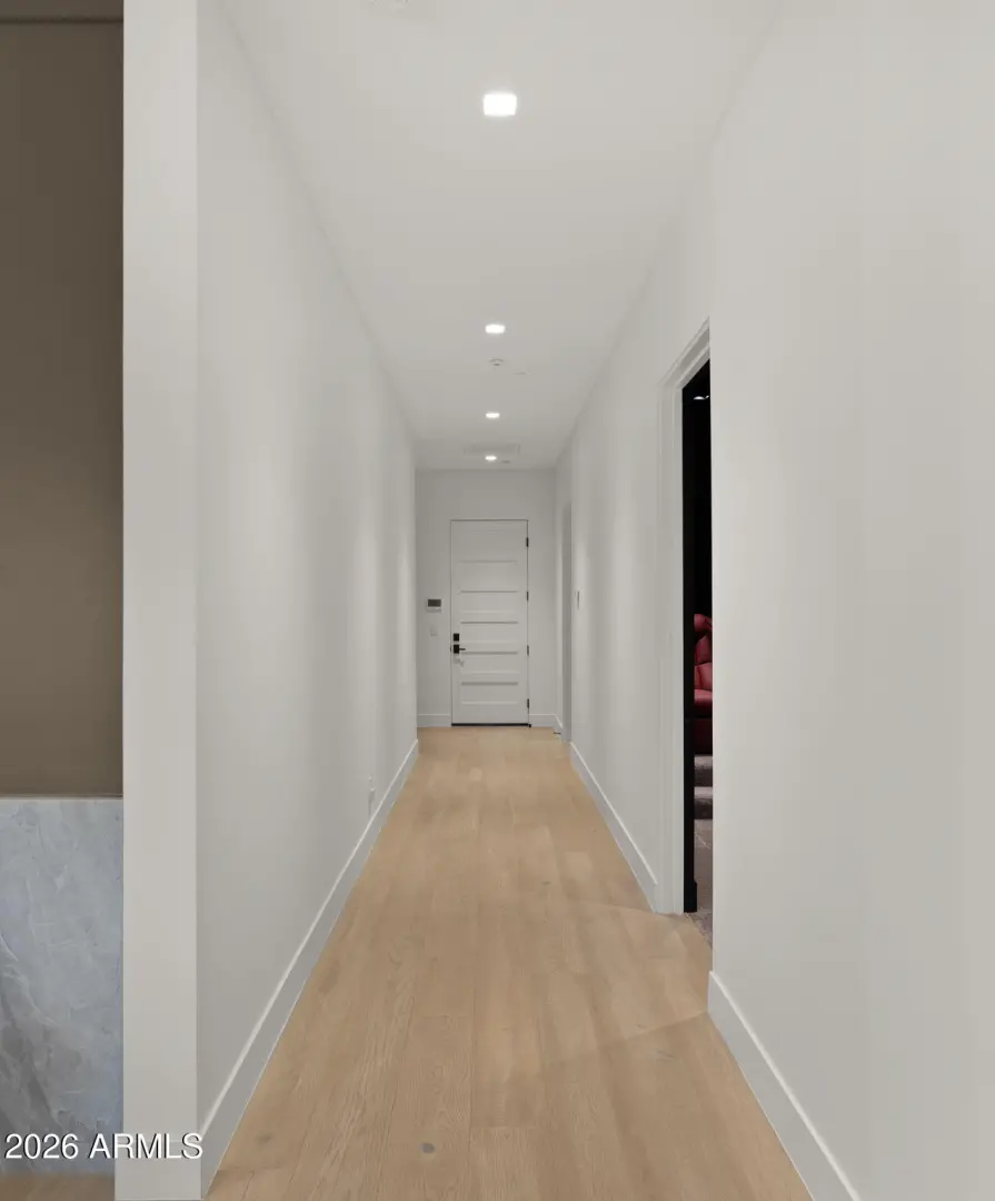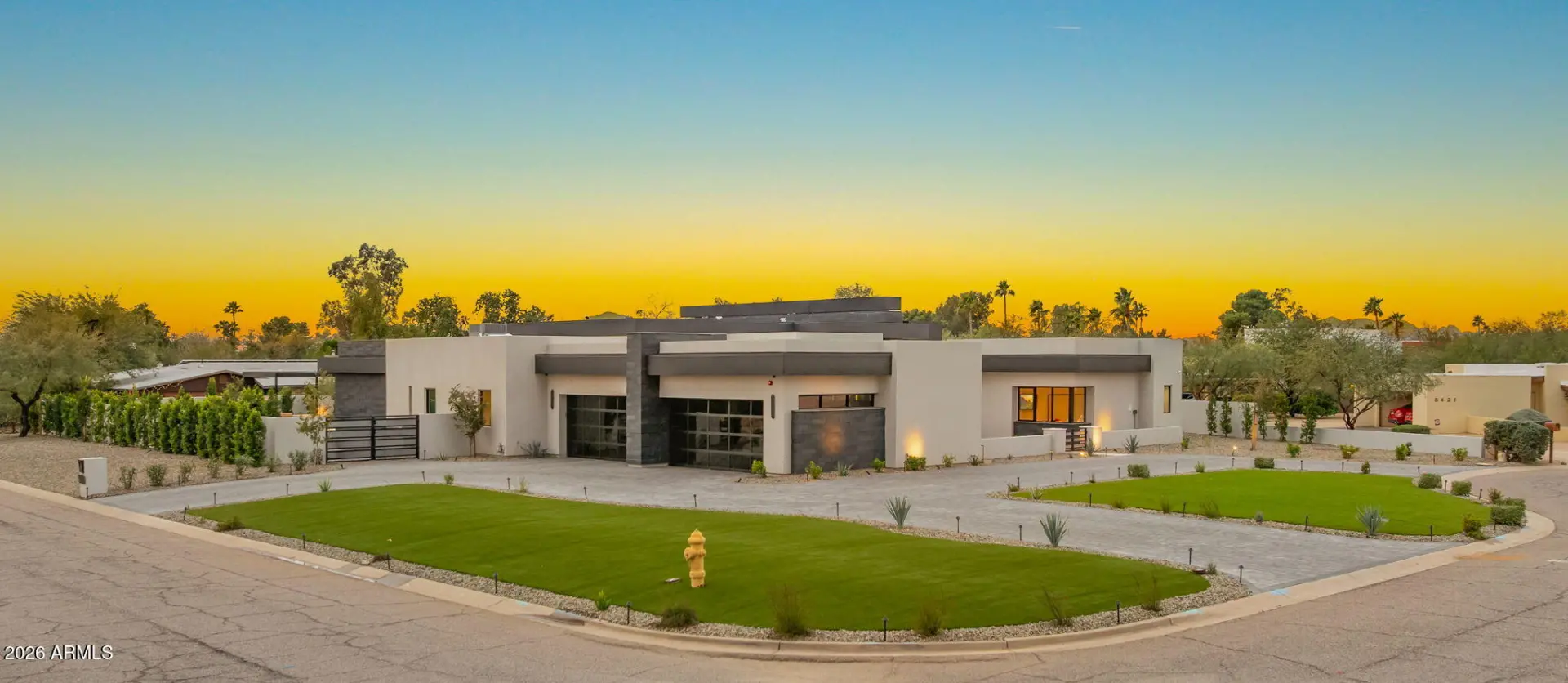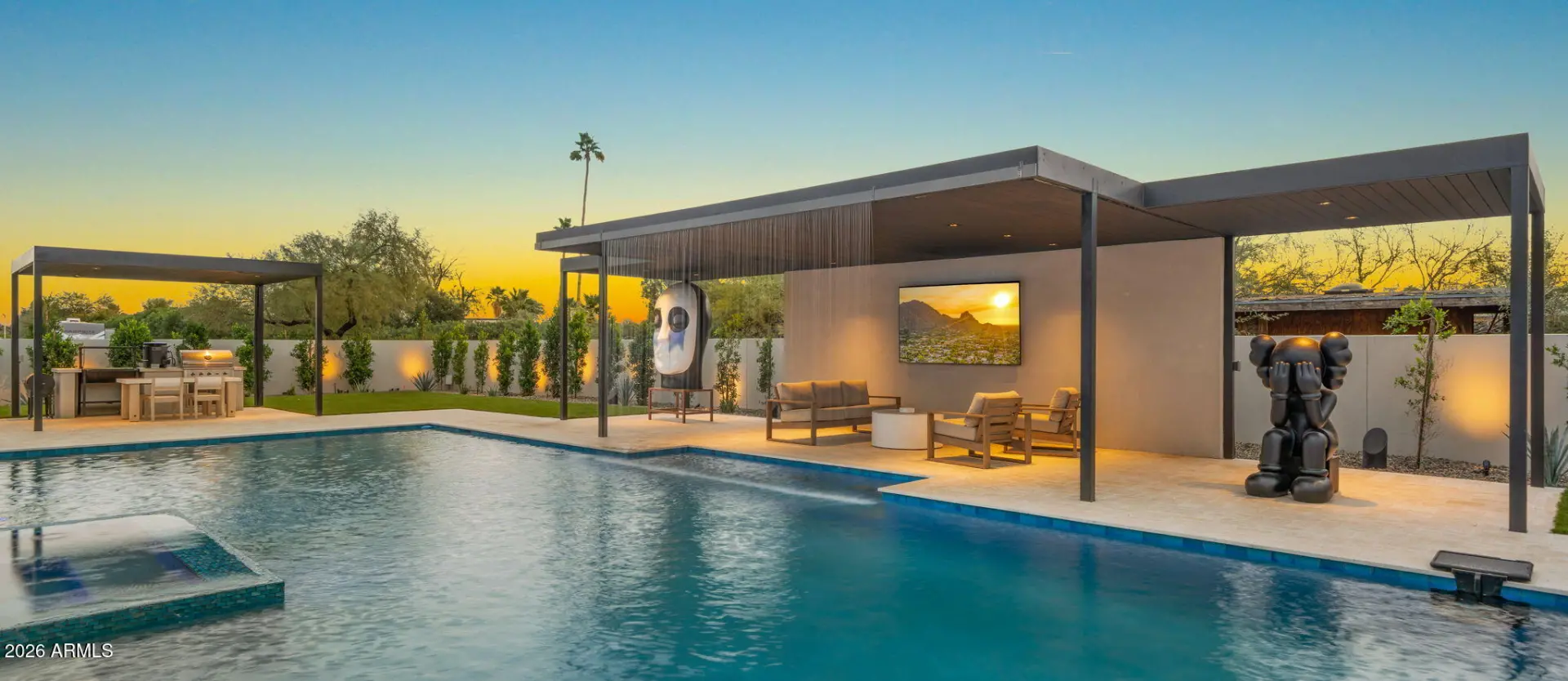 This newly built 2025 contemporary estate in the coveted Cactus Corridor delivers modern luxury and resort-style living. Offering 5,765 total marketable sq ft, including a 5,165 sq ft main residence and 600.7 sq ft guest house, the home features 5 bedrooms, 6 baths, a private movie theater, smart home AV, dual kitchen islands, designer cabinetry, hidden pantry, full bar with wine display, 4-car garage, and a resort backyard with lap pool, spa, BBQ, and batting cage.