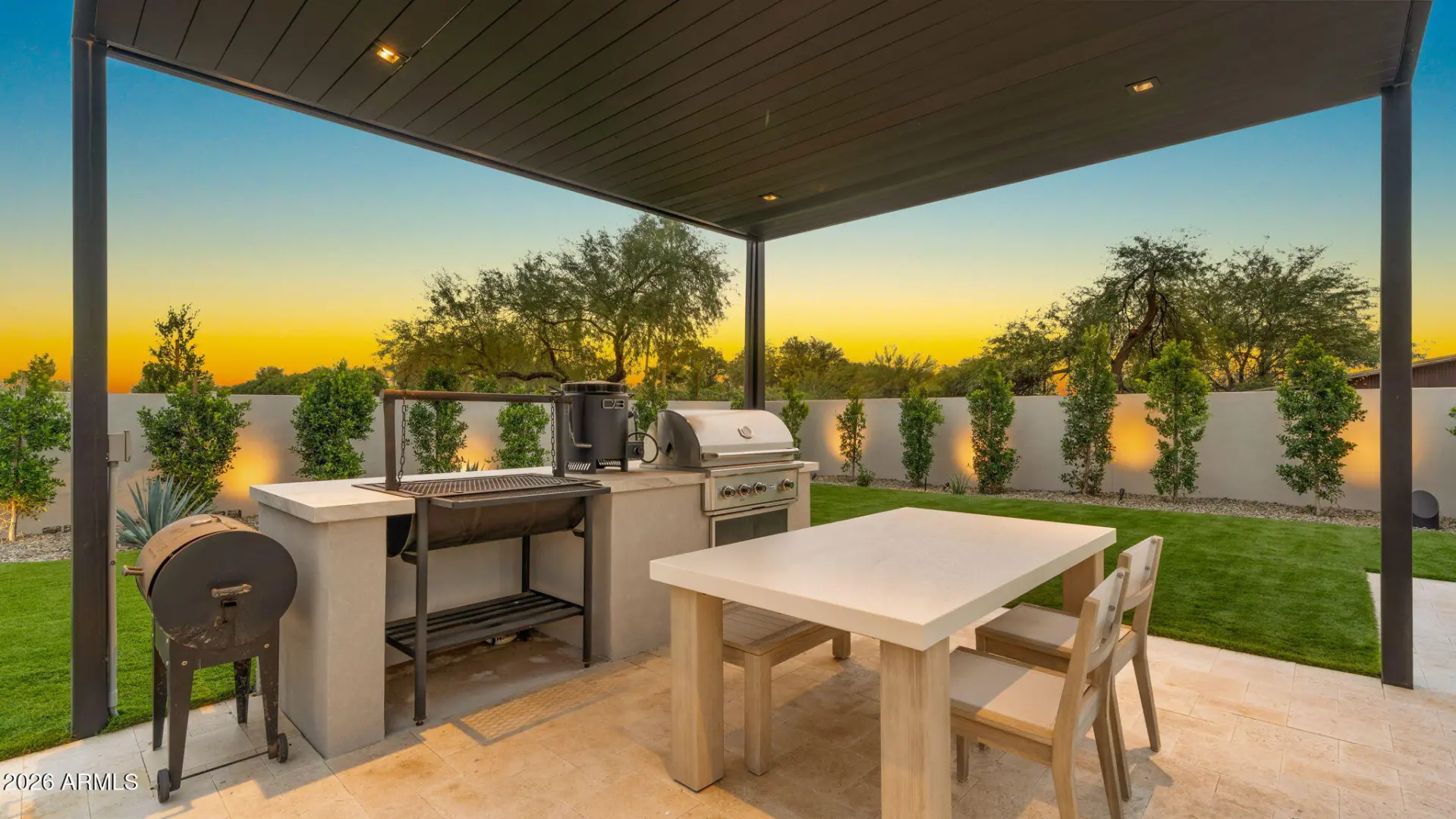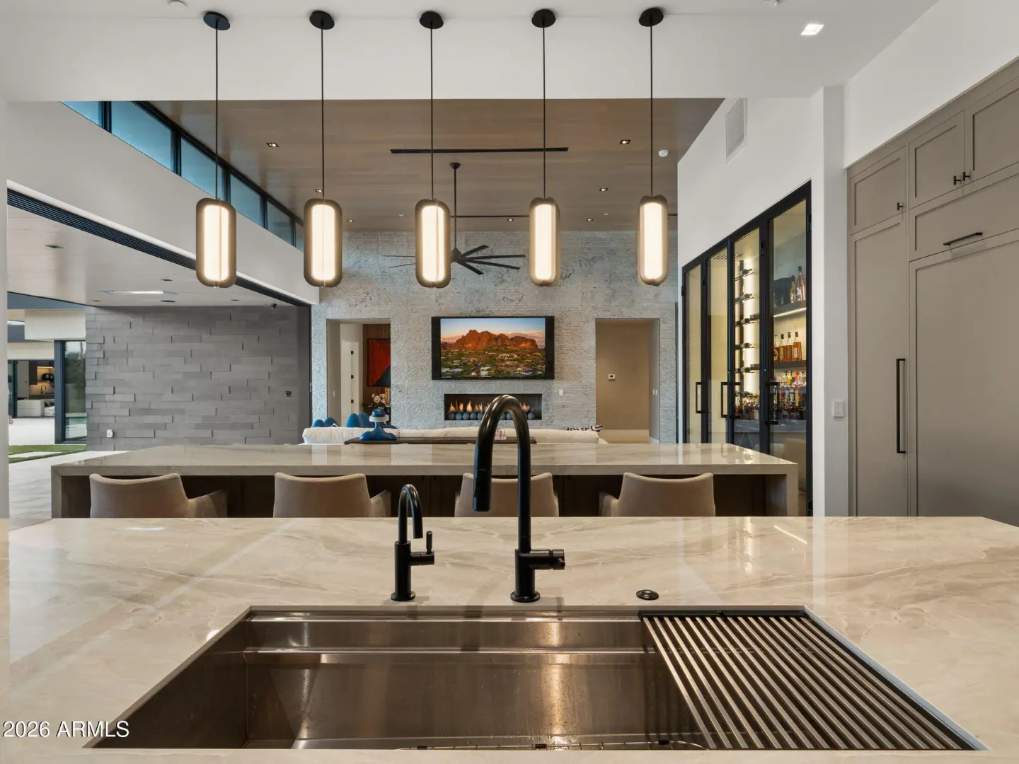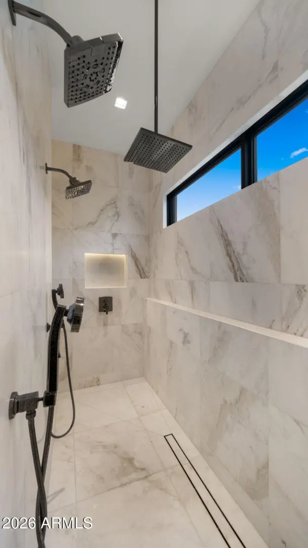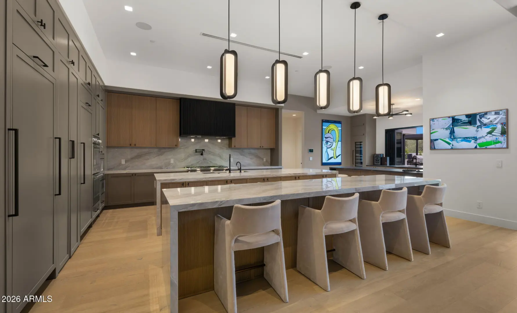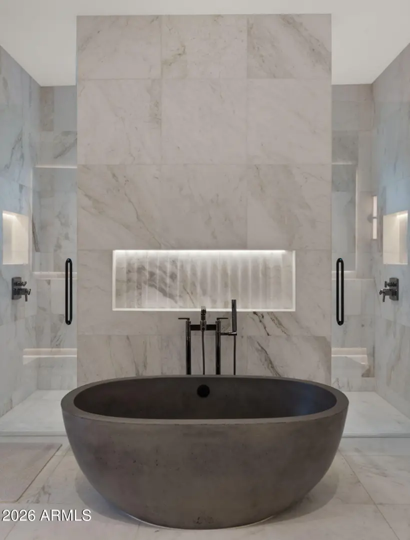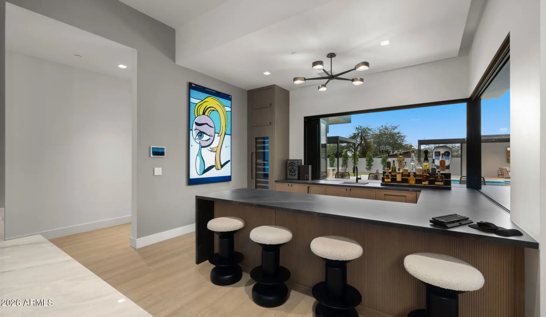 This newly built 2025 contemporary estate in the coveted Cactus Corridor delivers modern luxury and resort-style living. Offering 5,765 total marketable sq ft, including a 5,165 sq ft main residence and 600.7 sq ft guest house, the home features 5 bedrooms, 6 baths, a private movie theater, smart home AV, dual kitchen islands, designer cabinetry, hidden pantry, full bar with wine display, 4-car garage, and a resort backyard with lap pool, spa, BBQ, and batting cage.