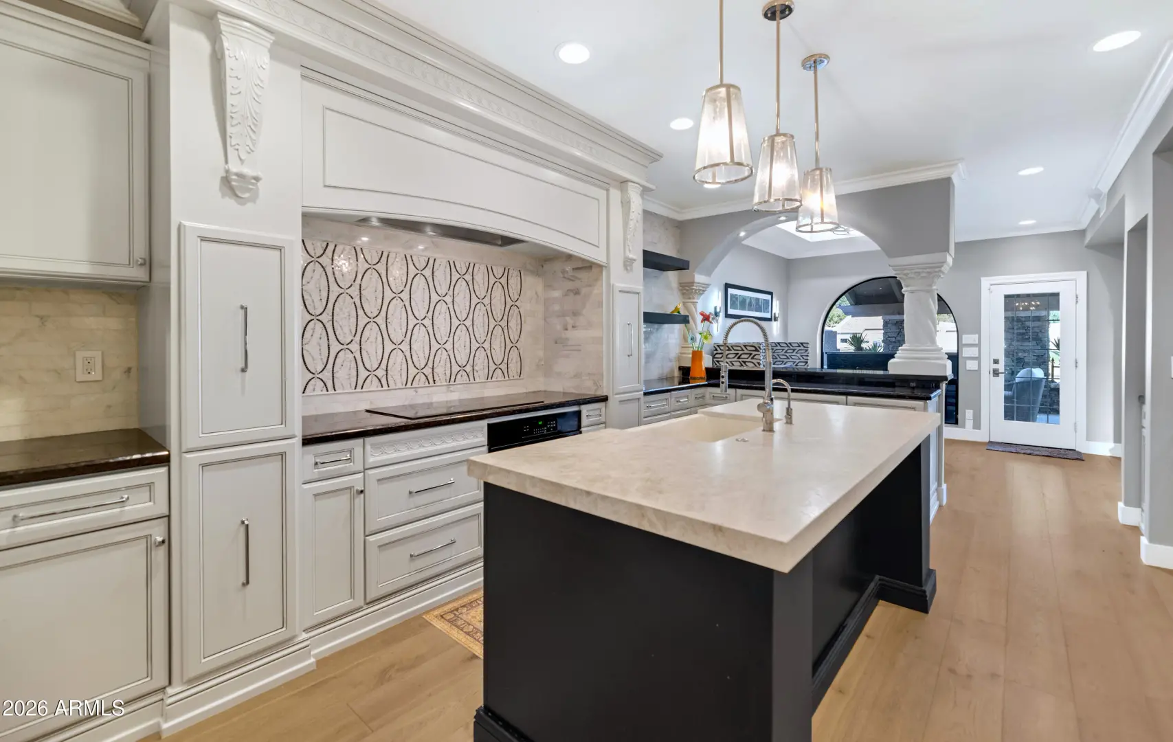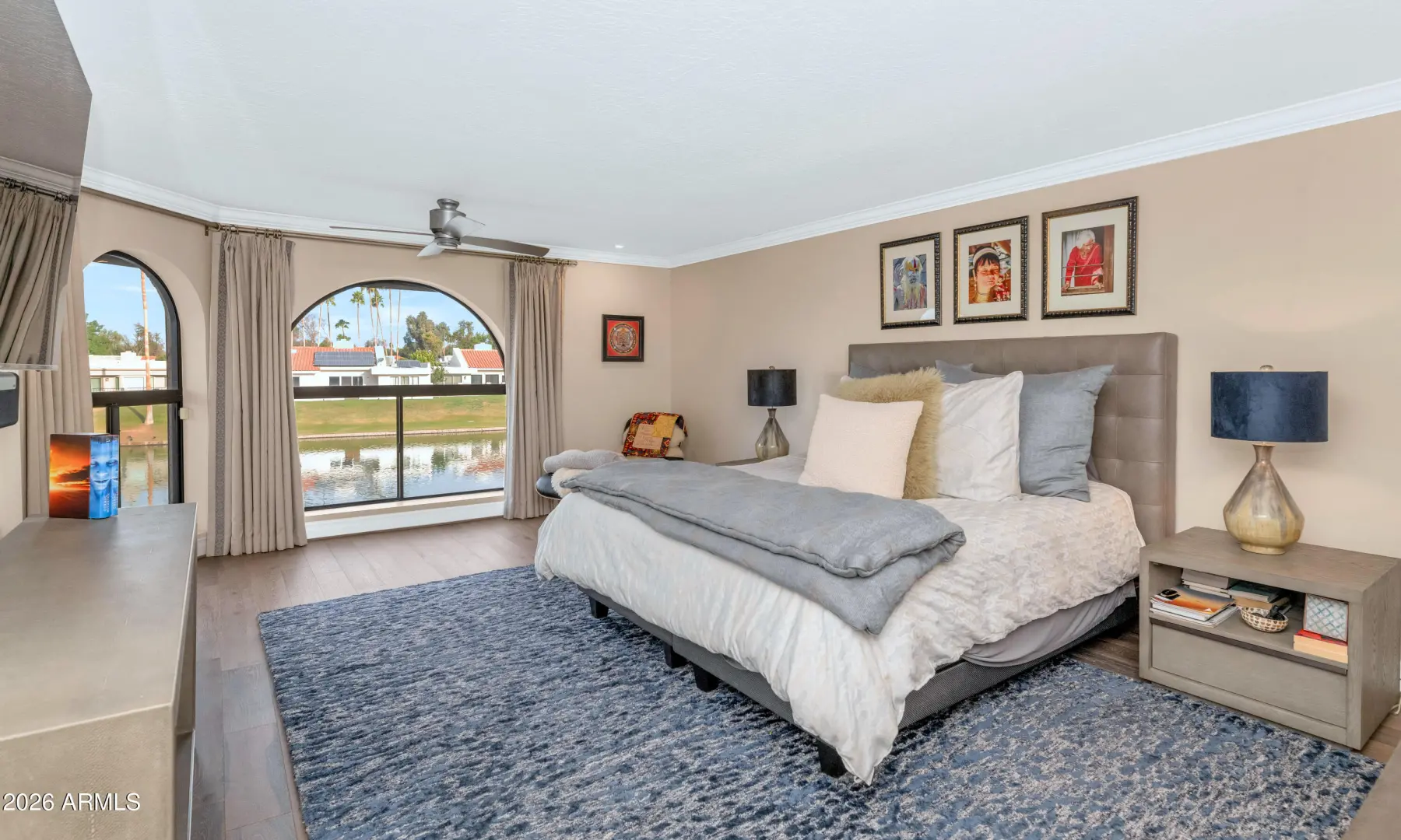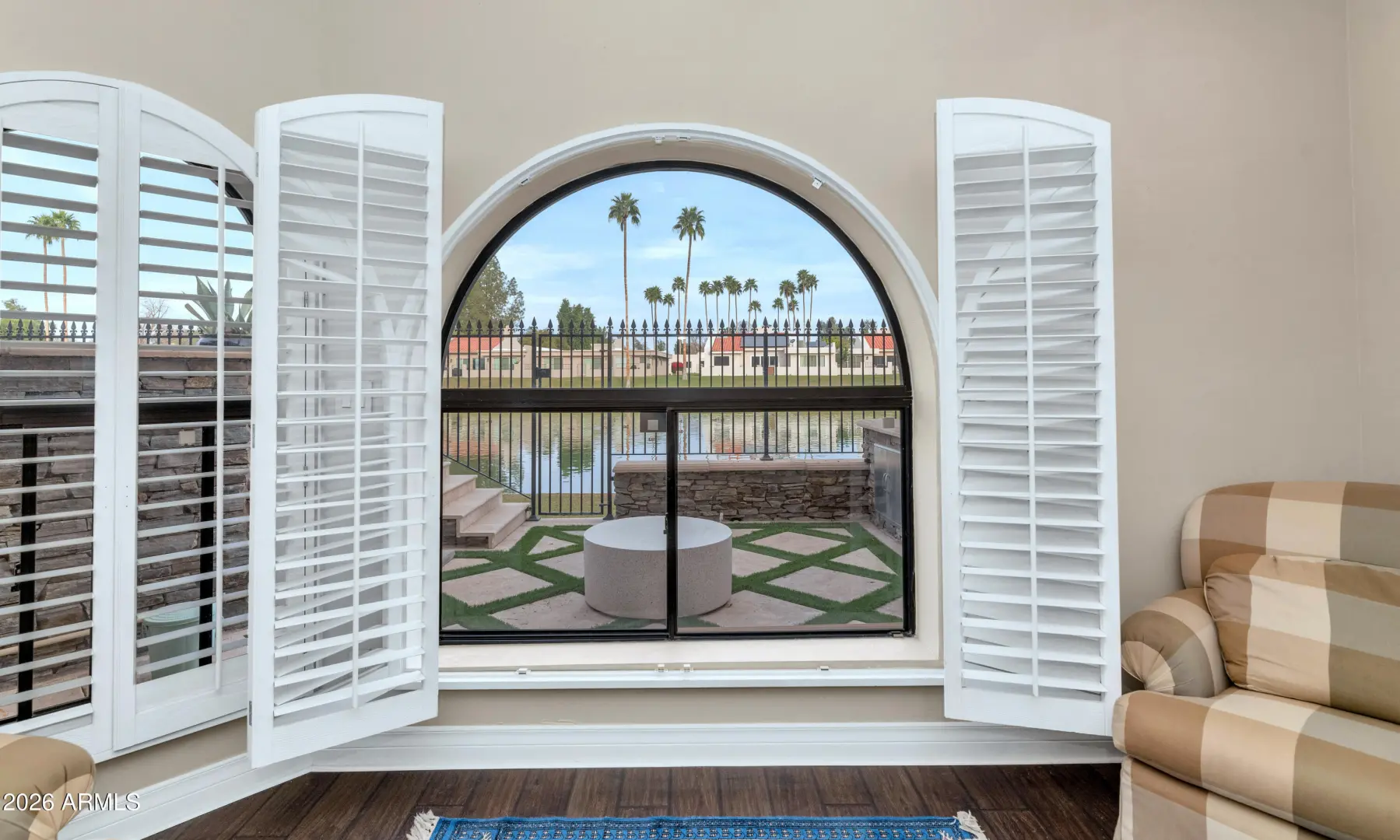 Set along the shores of Lake Angela, this exceptional waterfront residence is nestled within the highly sought-after, gated community of Las Palomas. A dramatic arched entry framed by expansive windows welcomes you inside, highlighting a sculptural curved iron staircase, statement chandeliers, and beautiful tongue-and-groove ceilings. Beautiful wood flooring flows throughout the home, creating warmth and continuity in every space. The main living area is both elegant and inviting, featuring exposed wood beams, a striking stone fireplace, and a wall of windows capturing serene lake views. Designed for effortless entertaining, the home offers both formal and casual gathering spaces that flow seamlessly together. The designer kitchen is a true centerpiece, showcasing leathered Taj