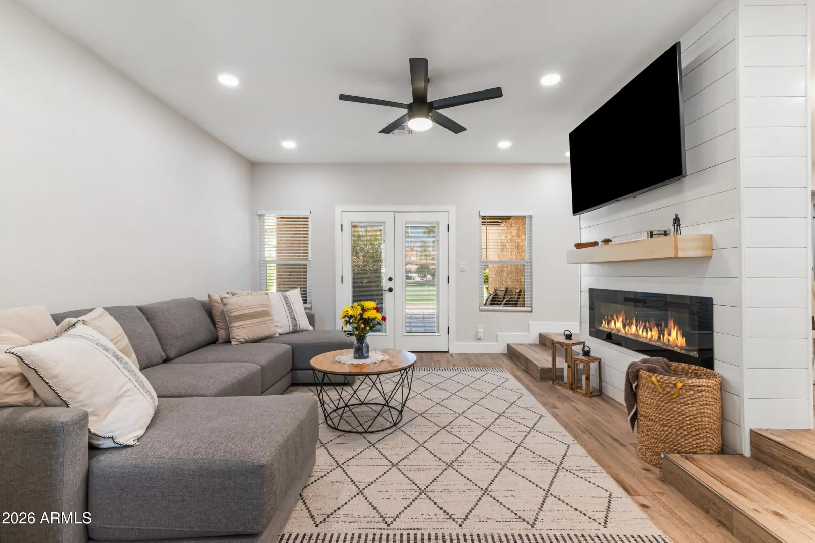 Rare 3 bedroom floor plan in the heart of McCormick Ranch, fully renovated in 2023. This bright, natural light filled townhome features clean modern finishes, an electric fireplace, and thoughtful upgrades throughout. The kitchen offers stainless steel appliances purchased in 2023, microwave drawer, wine fridge in the coffee bar, generous storage, and washer and dryer included. Smart features include a Nest thermostat and smart locks. Spacious primary suite with walk in closet. Tiled back patio with direct greenbelt access. Community pools, spas, tennis, fitness center, and clubhouse. Minutes to Old Town, golf, dining, and shopping.