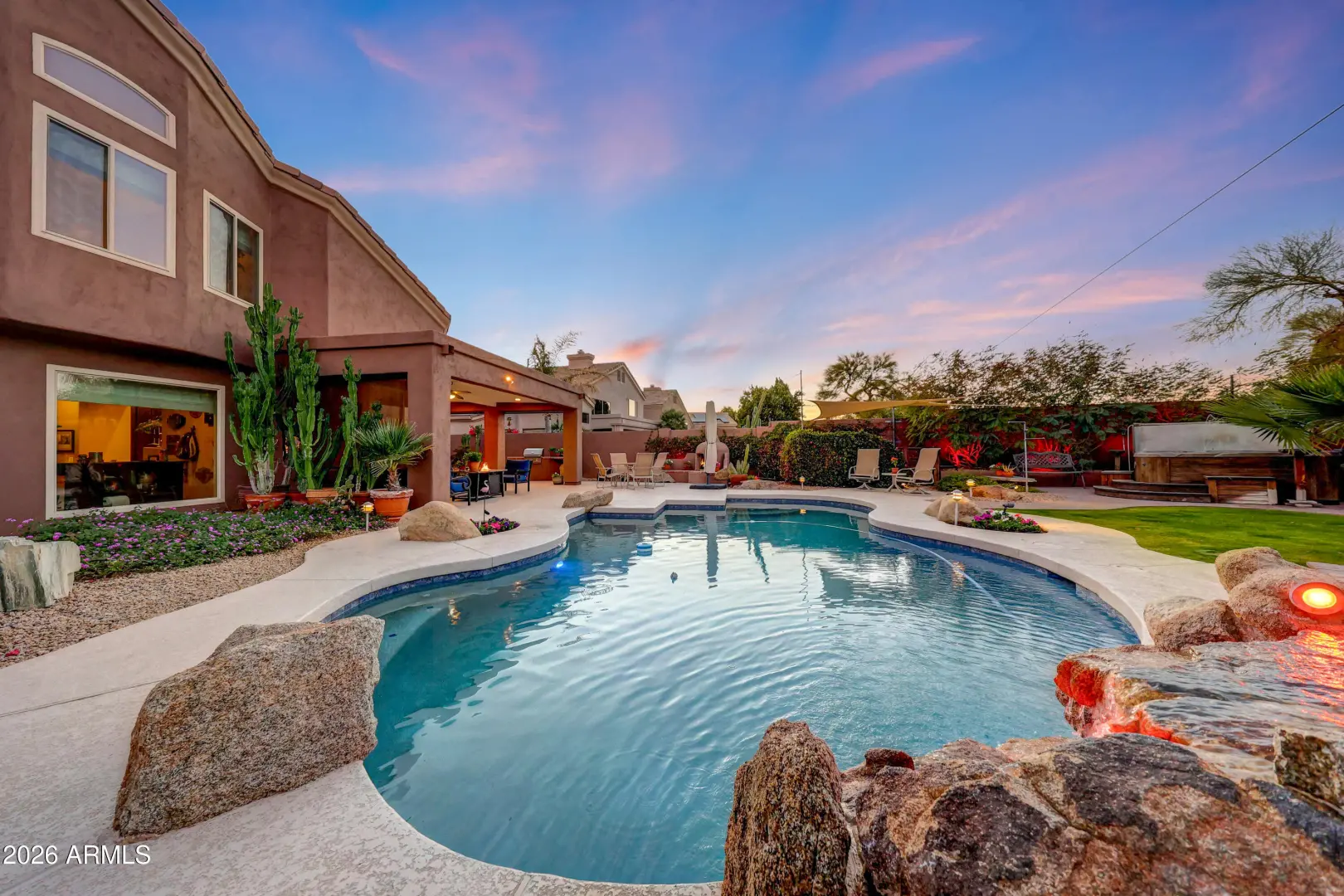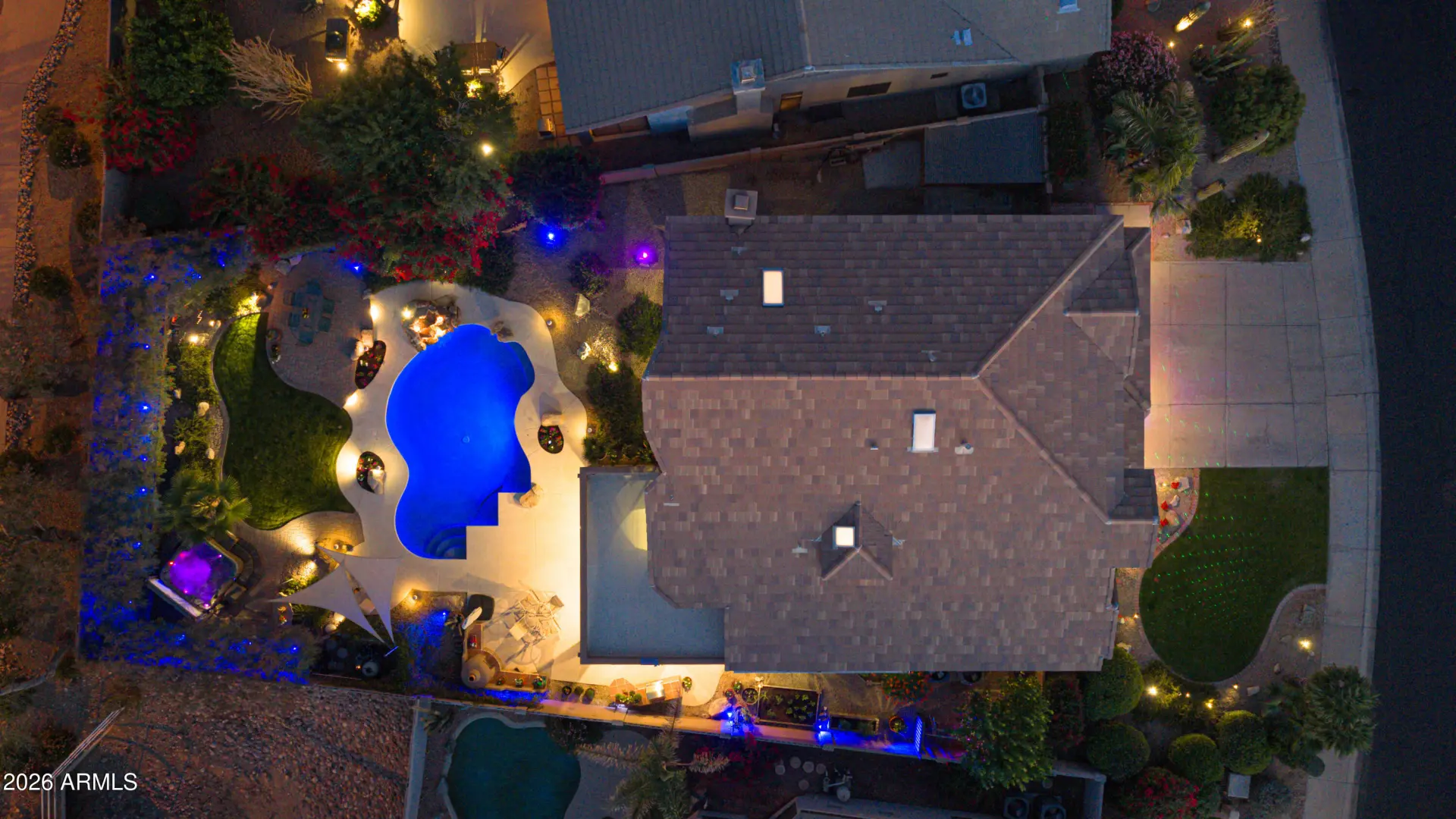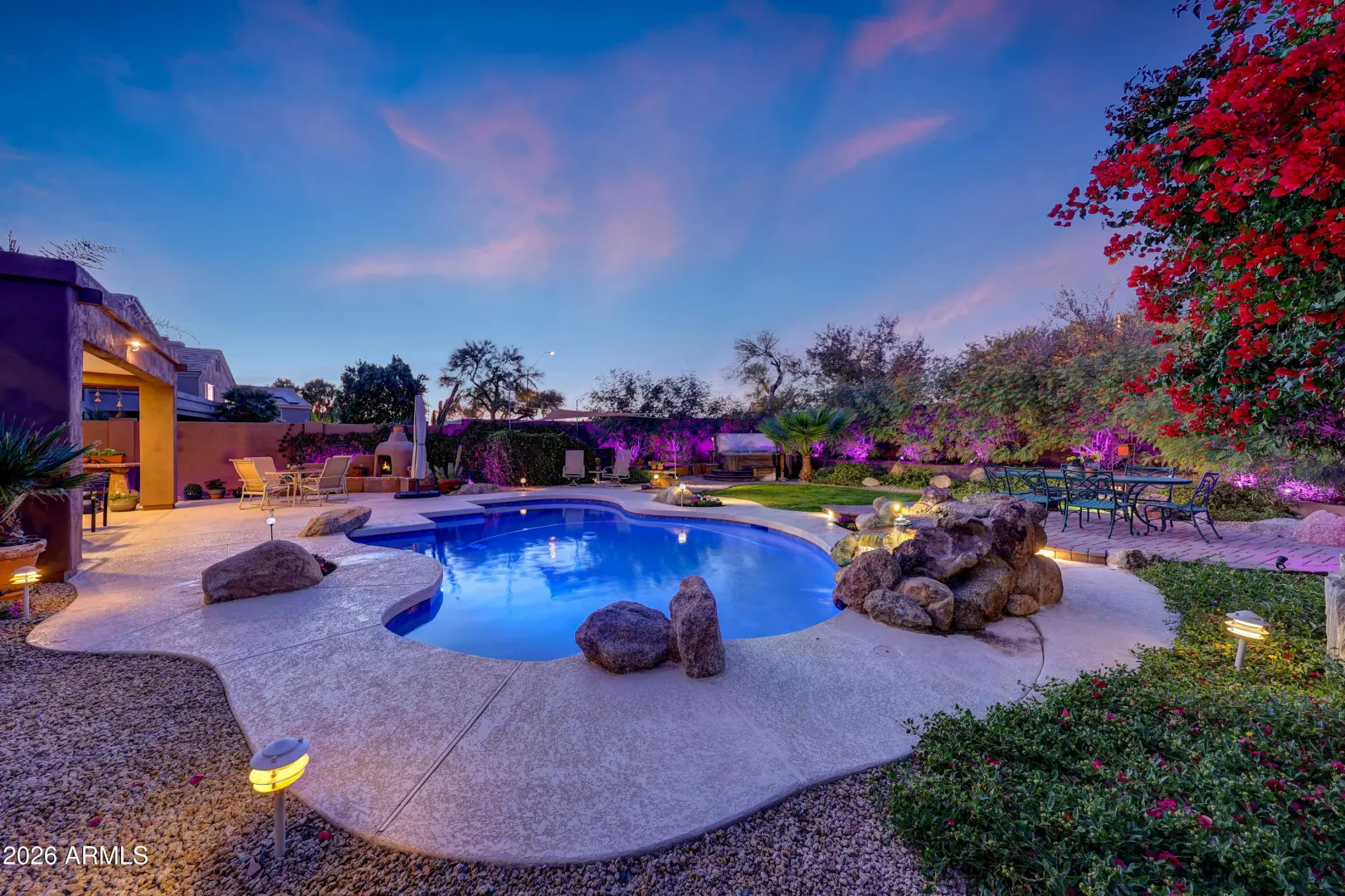A rare find in the highly desirable Camelot Ranch neighborhood! This tastefully upgraded residence features 5 spacious bedrooms (or 4 bedrooms plus a versatile den, office, or recreational room) and 3 luxurious bathrooms, all situated on a generous homesite that promises both privacy and stunning mountain views. Front door open to soaring ceilings and light filled spaces. The large living and dining room flows effortlessly! Step outside to discover your own backyard oasis, beautifully landscaped for relaxation and entertainment. The covered patio and inviting pool create the perfect setting for gatherings with friends and family or for children to enjoy outdoor play.Inside, the open and bright floor plan offers the flexibility for both formal and relaxed living..